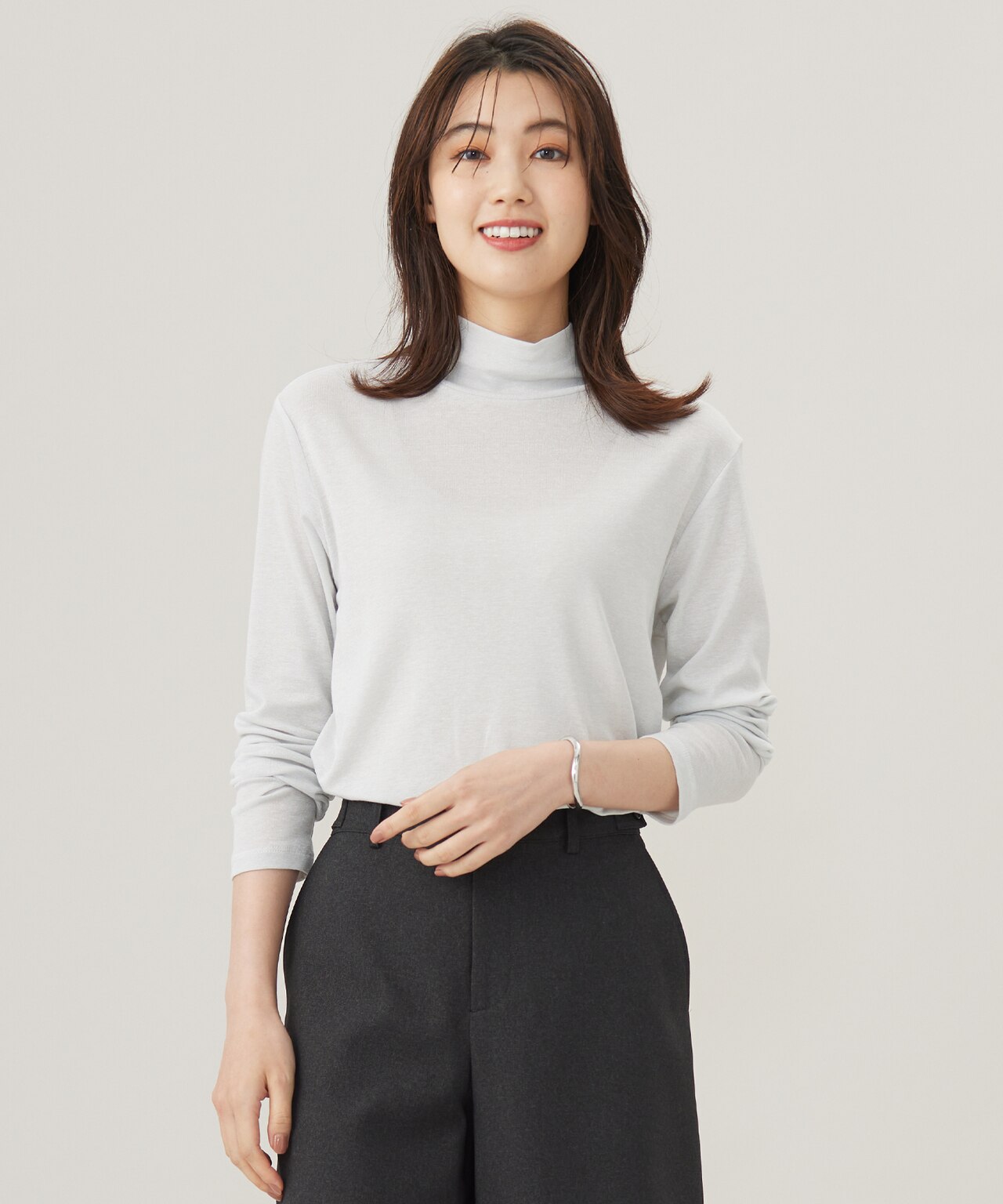 シャツやジャンスカのレイヤードに最適な、タートルネックカットソー。首にほどよく沿い、締め付けない絶妙なサイズ感です。やや袖を長めに仕上げており、クシュっとたわませて着ていただくのがおすすめ。シルバー(♯091)はほんのりとラメ感があり、トレンド感のあるコーディネートが楽しめます。