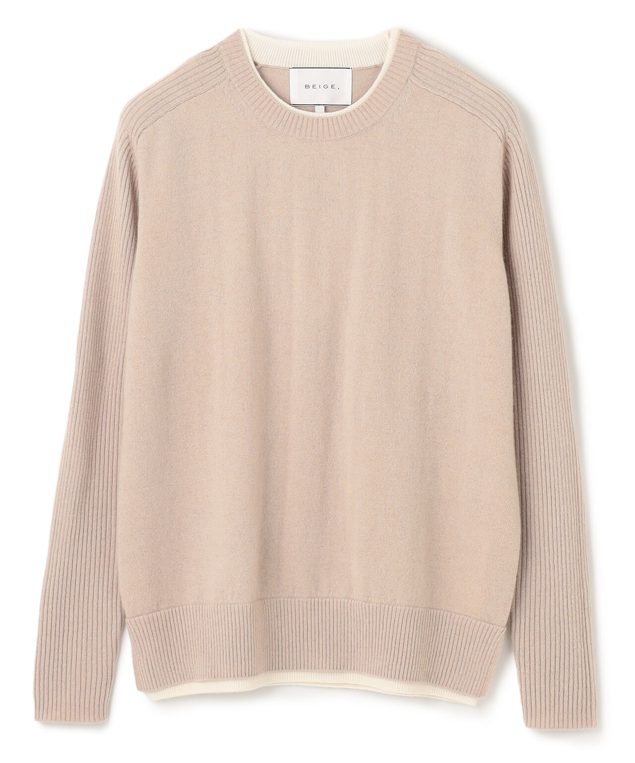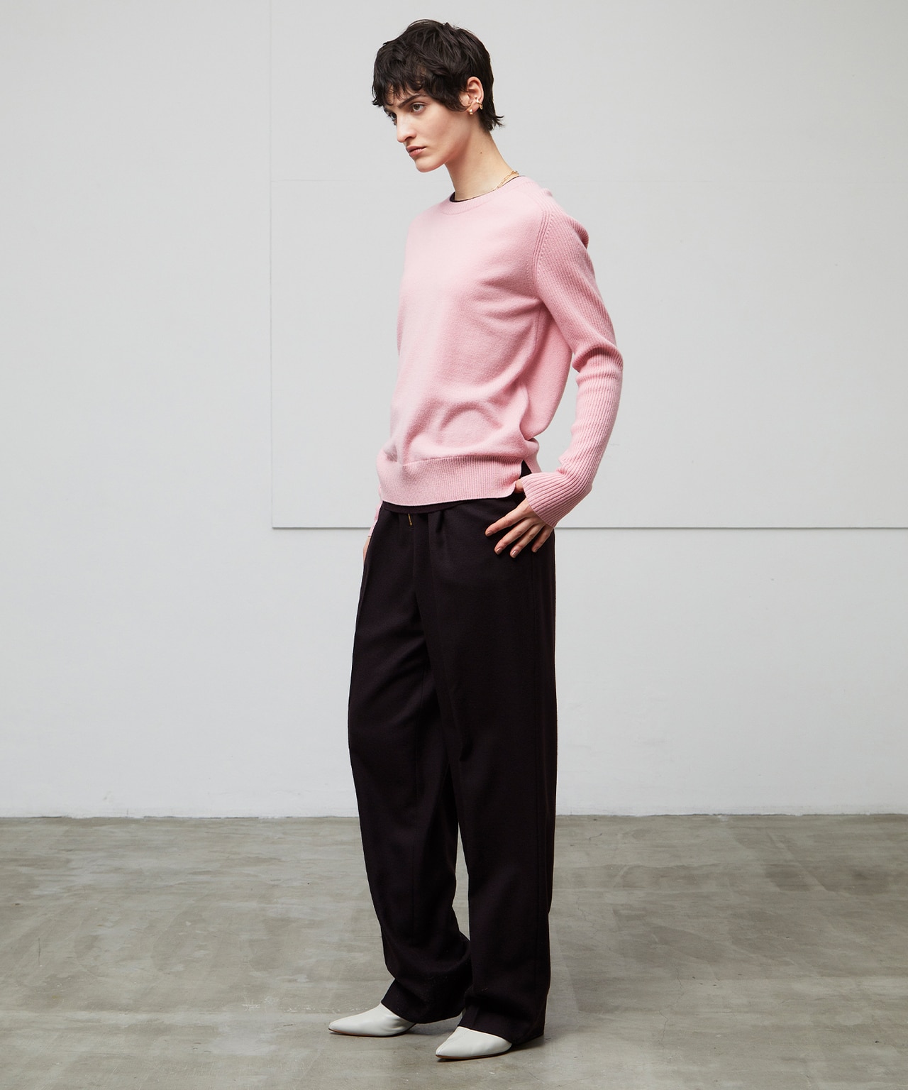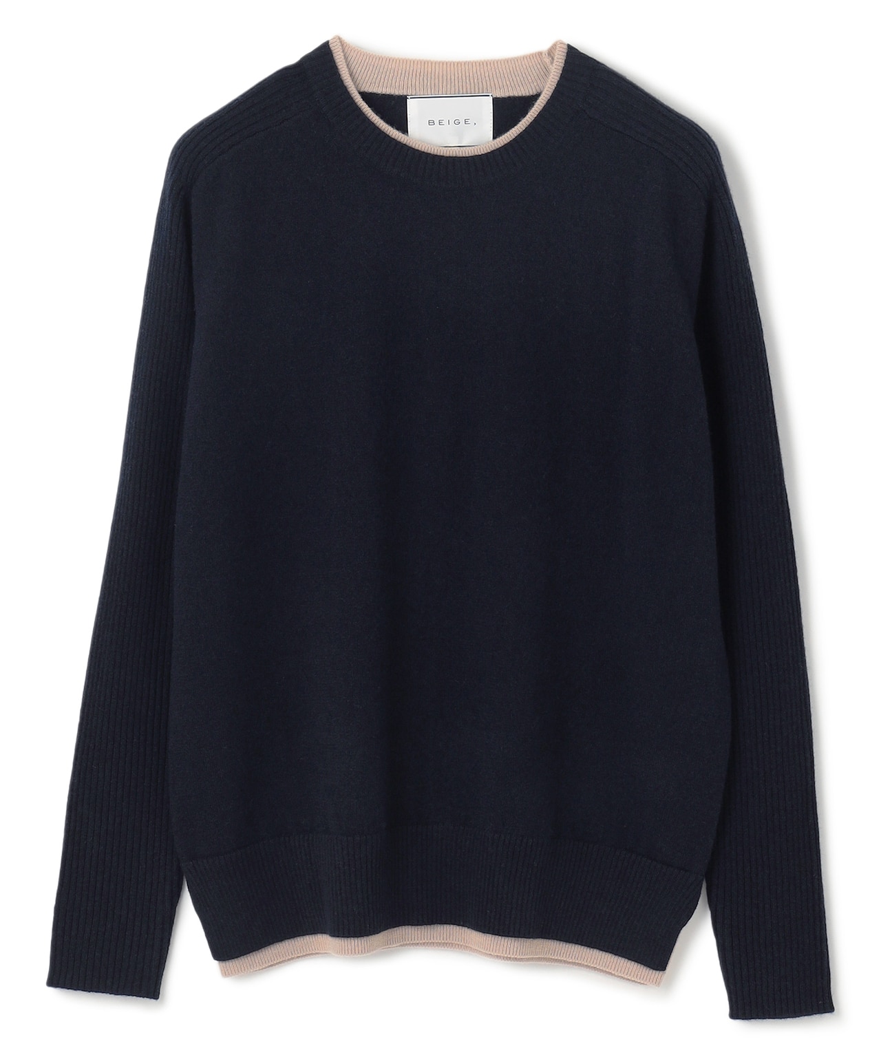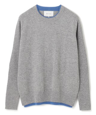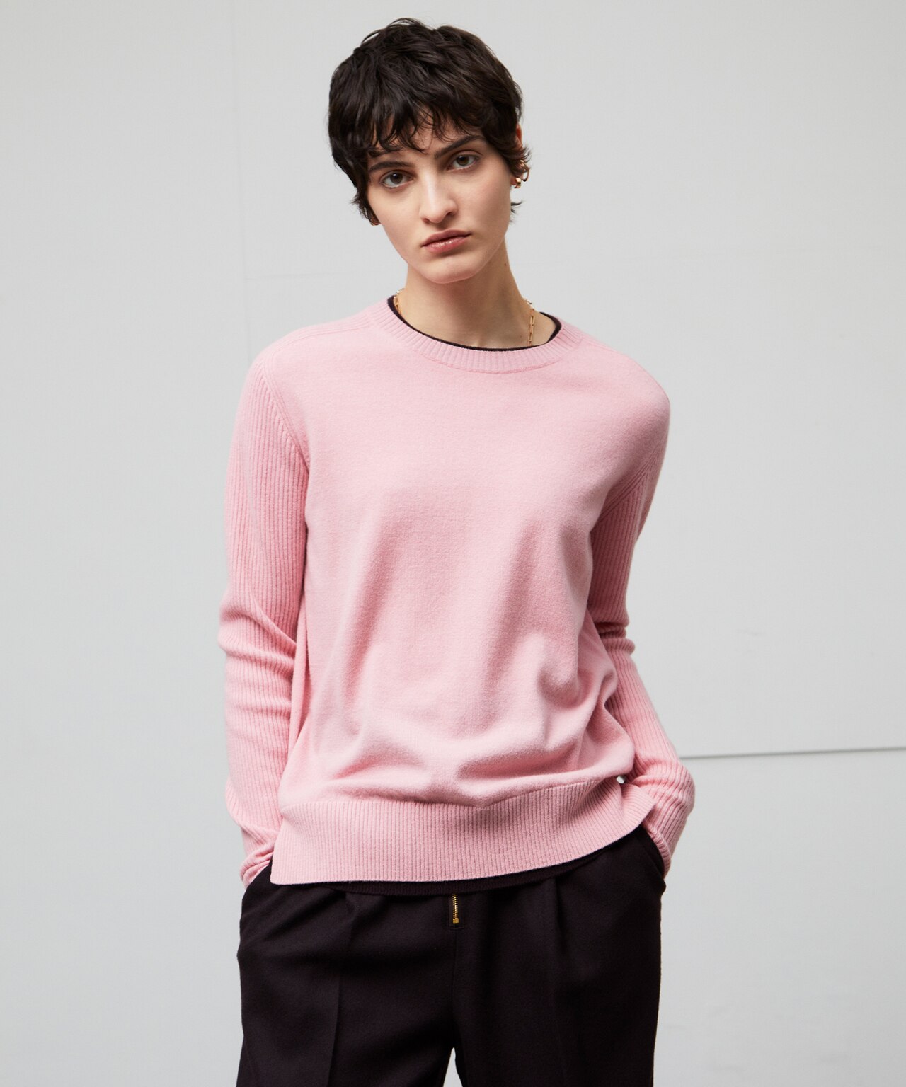 襟ぐりと裾に配色リブを施したクルーネックニット。ややゆったりとしたサイズ感でラインを拾わずに、襟元の配色カラーがアクセサリーなしでも華やかに見せてくれます。シンプルなシルエットだからこそ、色合いが引き立ち女性らしい抜け感を感じるニットです。
