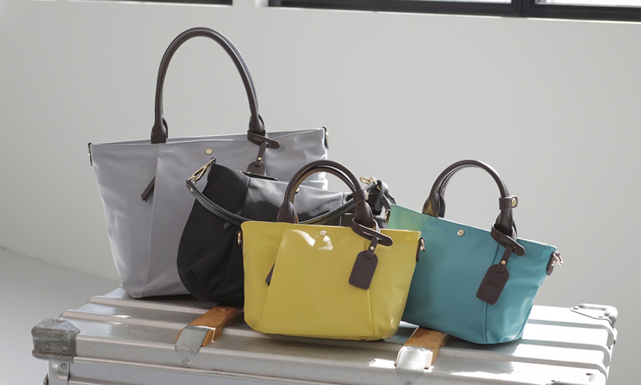 半艶のキレイめなナイロン素材。撥水効果があり、さっと拭き取れるので雨の日でもお使い頂け、汚れてもお手入れしやすく軽いのが特徴です。付属の牛革は艶のあるしっかりとした厚みのものを使用。丈夫で長くお使い頂けます。