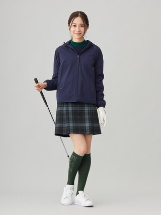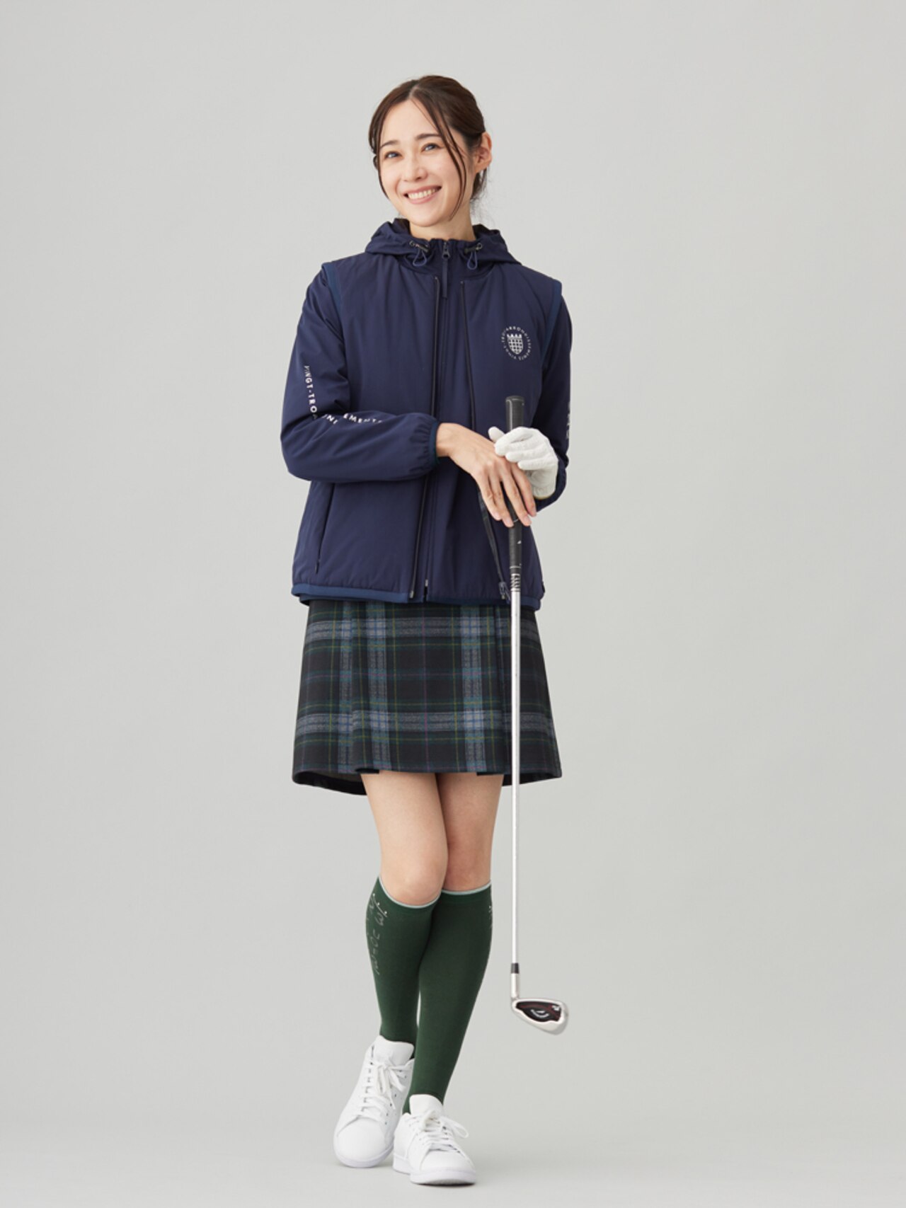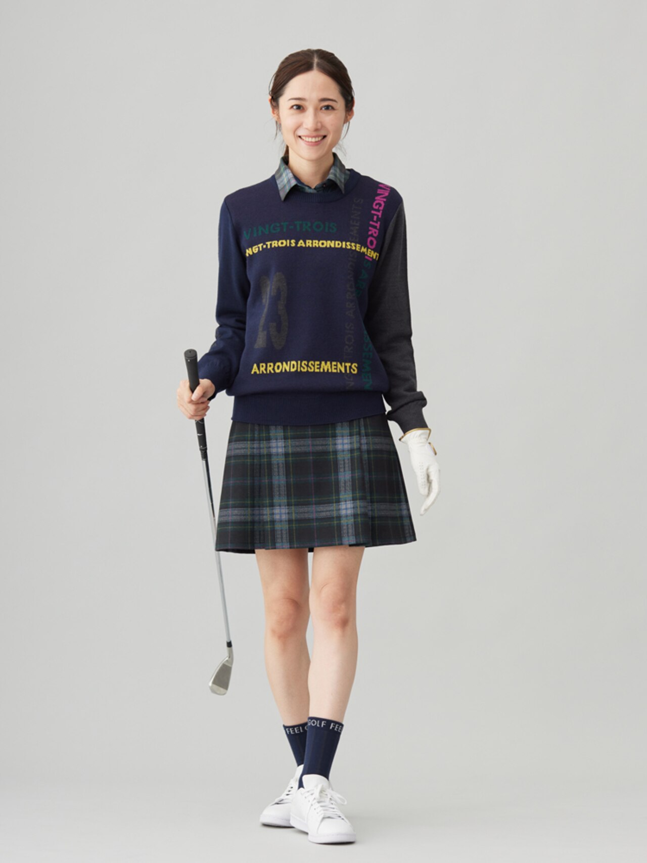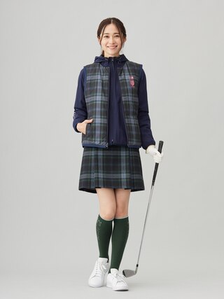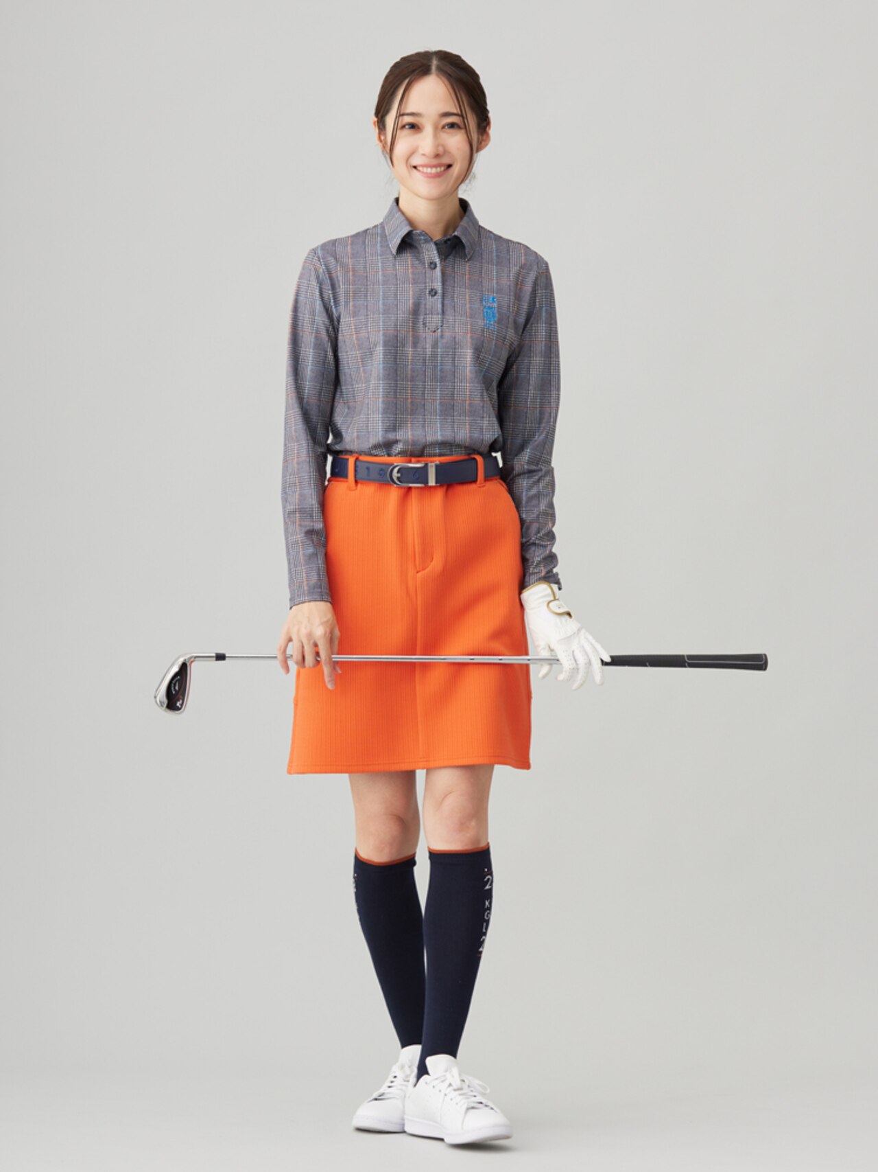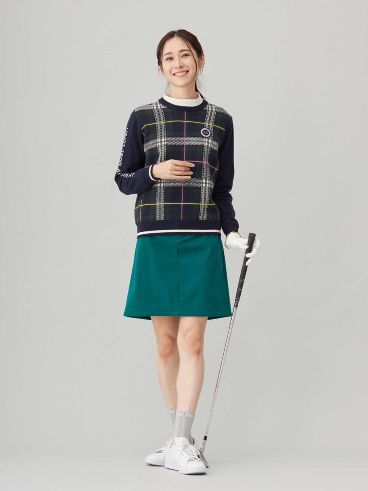 トラッドな印象を際立たせる落ち着いたトーンのチェック柄スカート。品よくエレガントな雰囲気の中に、細かいラインをカラーで入れて、ゴルフウェアらしく華やかさをプラス。濃色トップスでまとめると知的でエレガンスに、ラインと色味をリンクさせたトップスを合わせれば、レディスらしい素敵な着こなしに。