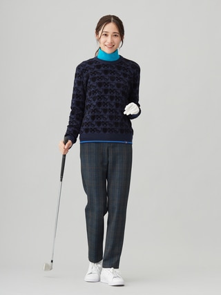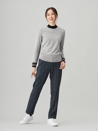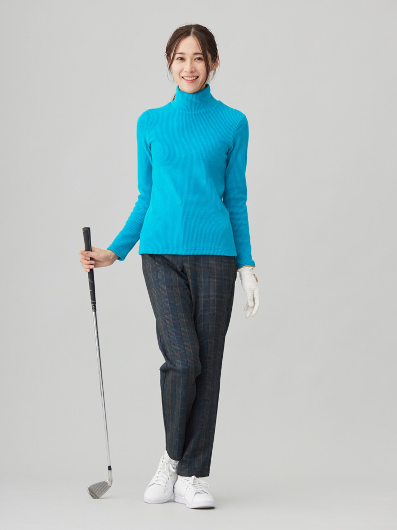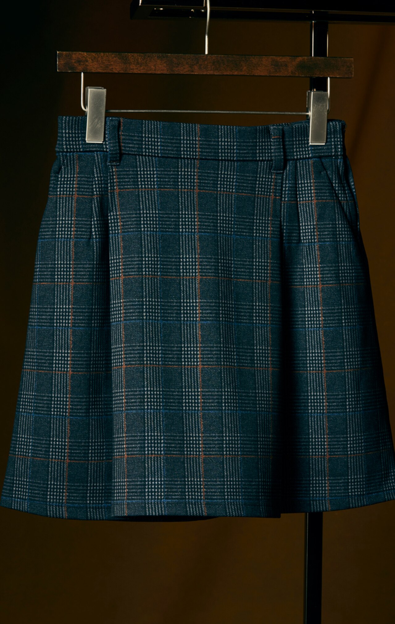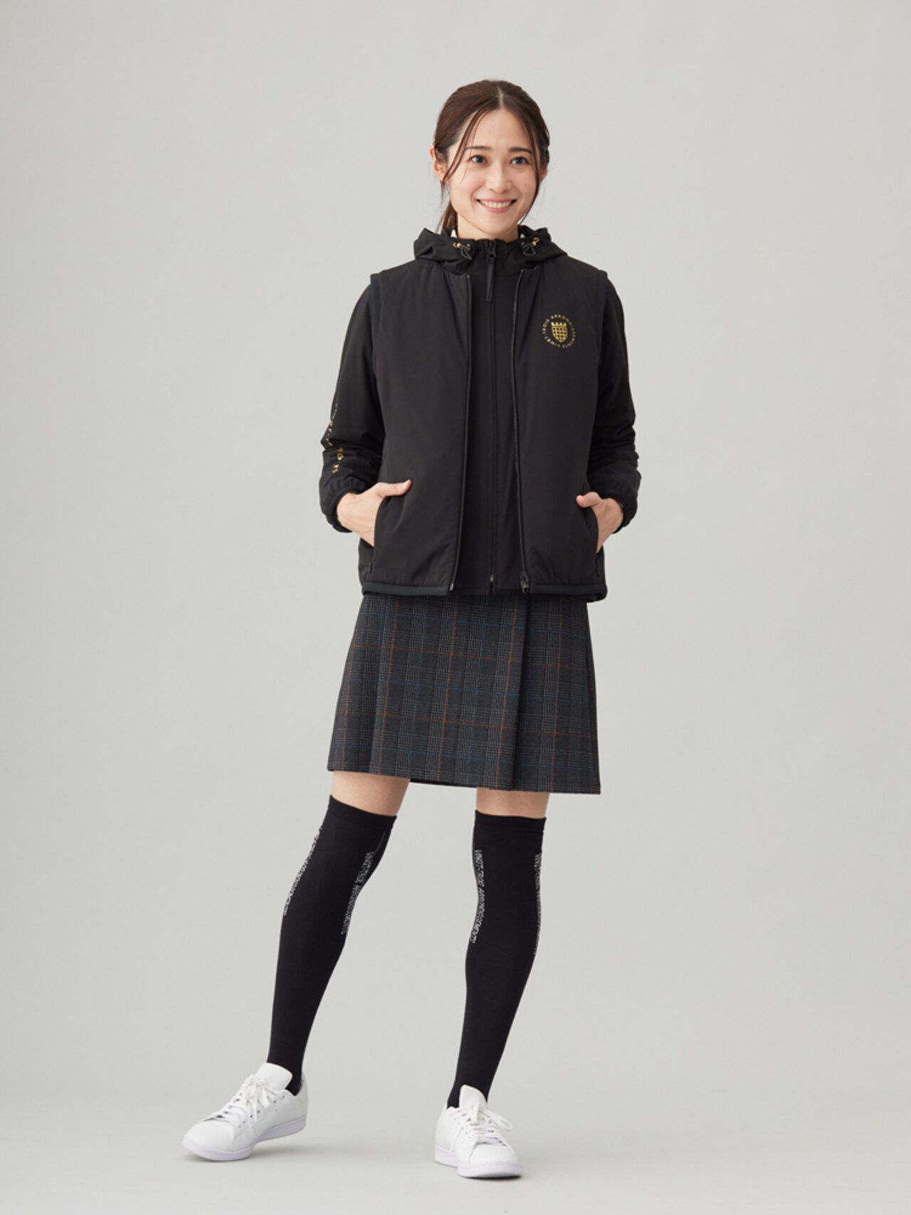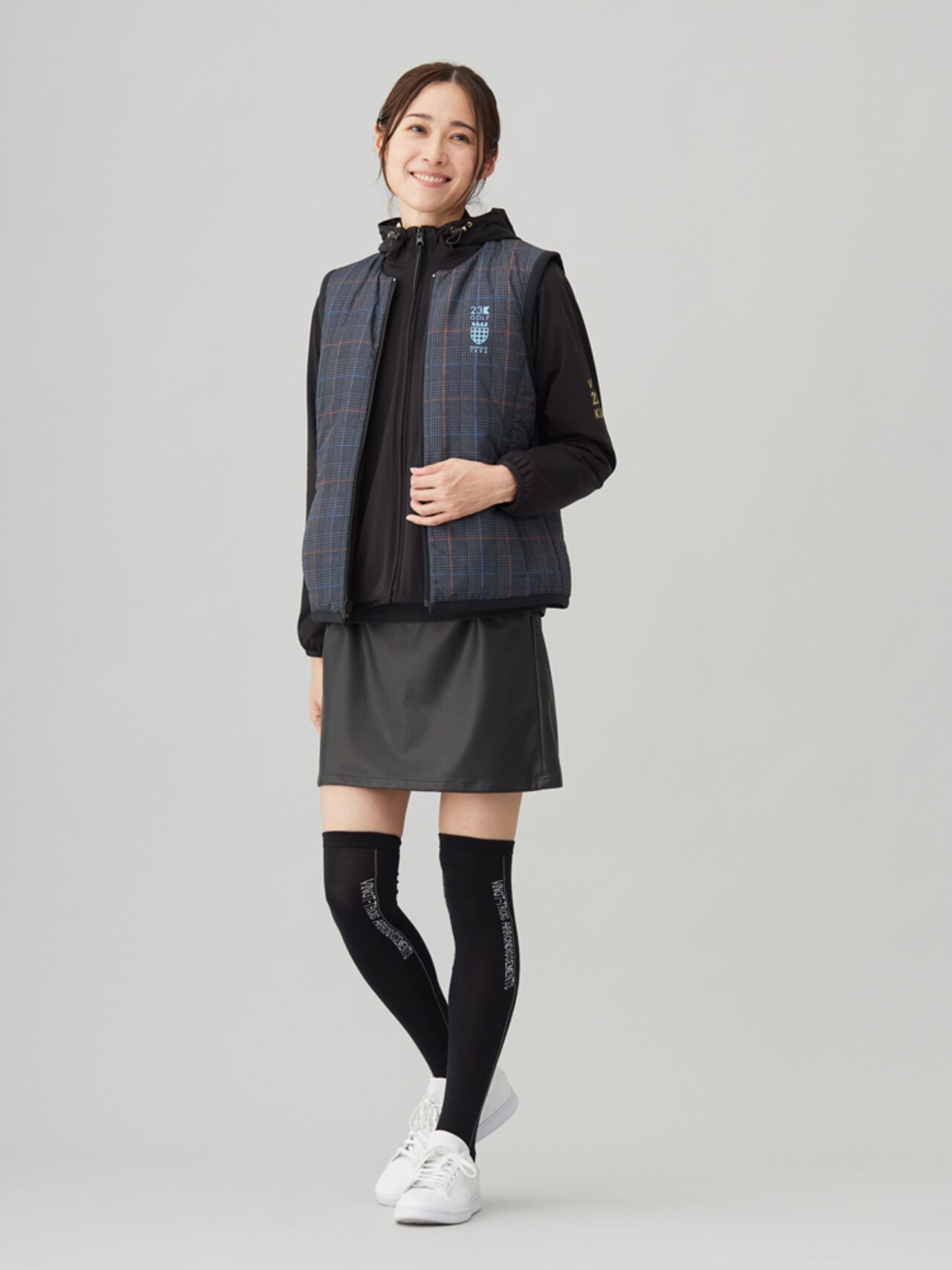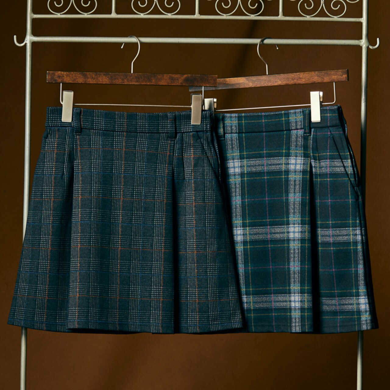 トラッドな印象を際立たせる落ち着いたトーンのチェック柄スカート。品よくエレガントな雰囲気の中に、細かいラインをカラーで入れて、ゴルフウェアらしく華やかさをプラス。濃色トップスでまとめると知的でエレガンスに、ラインと色味をリンクさせたトップスを合わせれば、レディスらしい素敵な着こなしに。