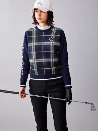 前後の身頃はチェック、袖は無地の切り替えデザイン、心地よい柄の見え感で大人のクラス感を演出。ゴルフウェアらしく華やかな差し色をアクセントに沿えた多彩な一枚。