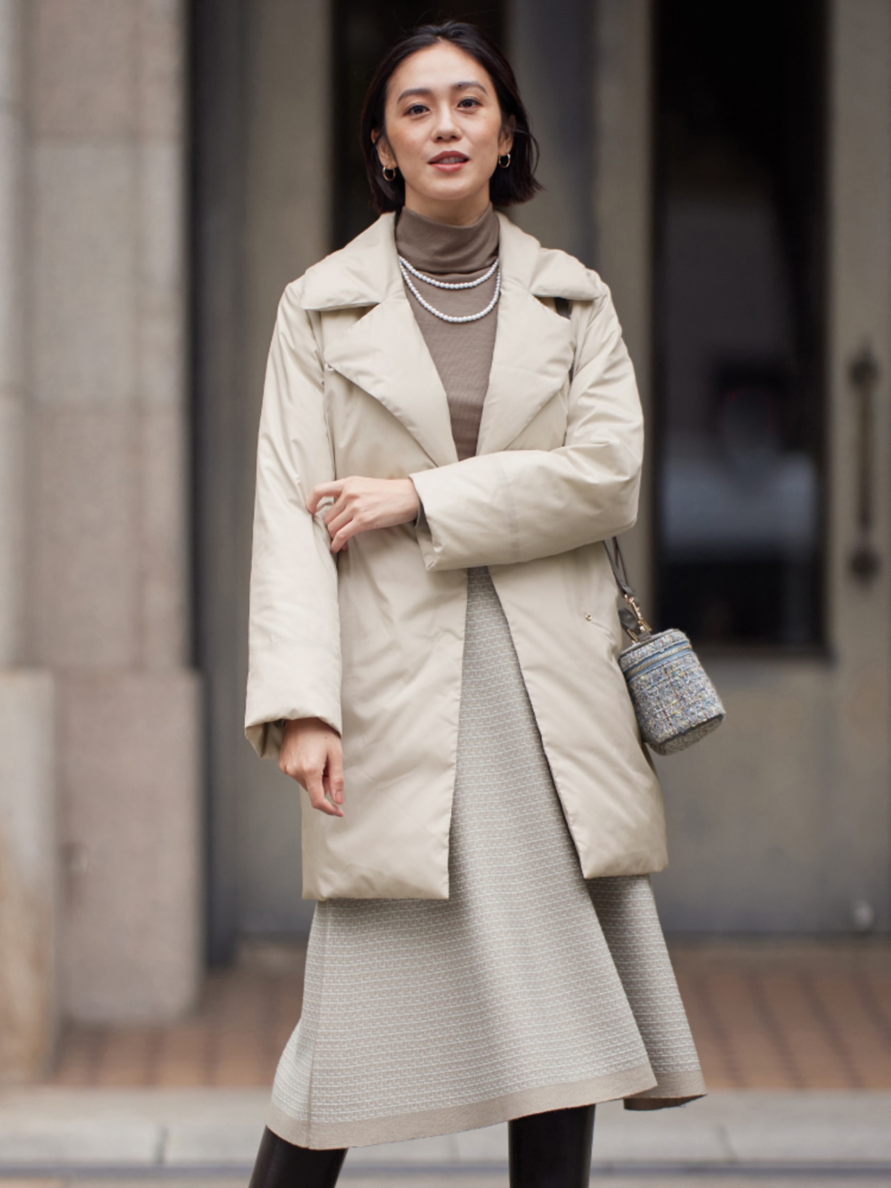 ブラックのロングコートを合わせれば、レストランディナーにもぴったり。