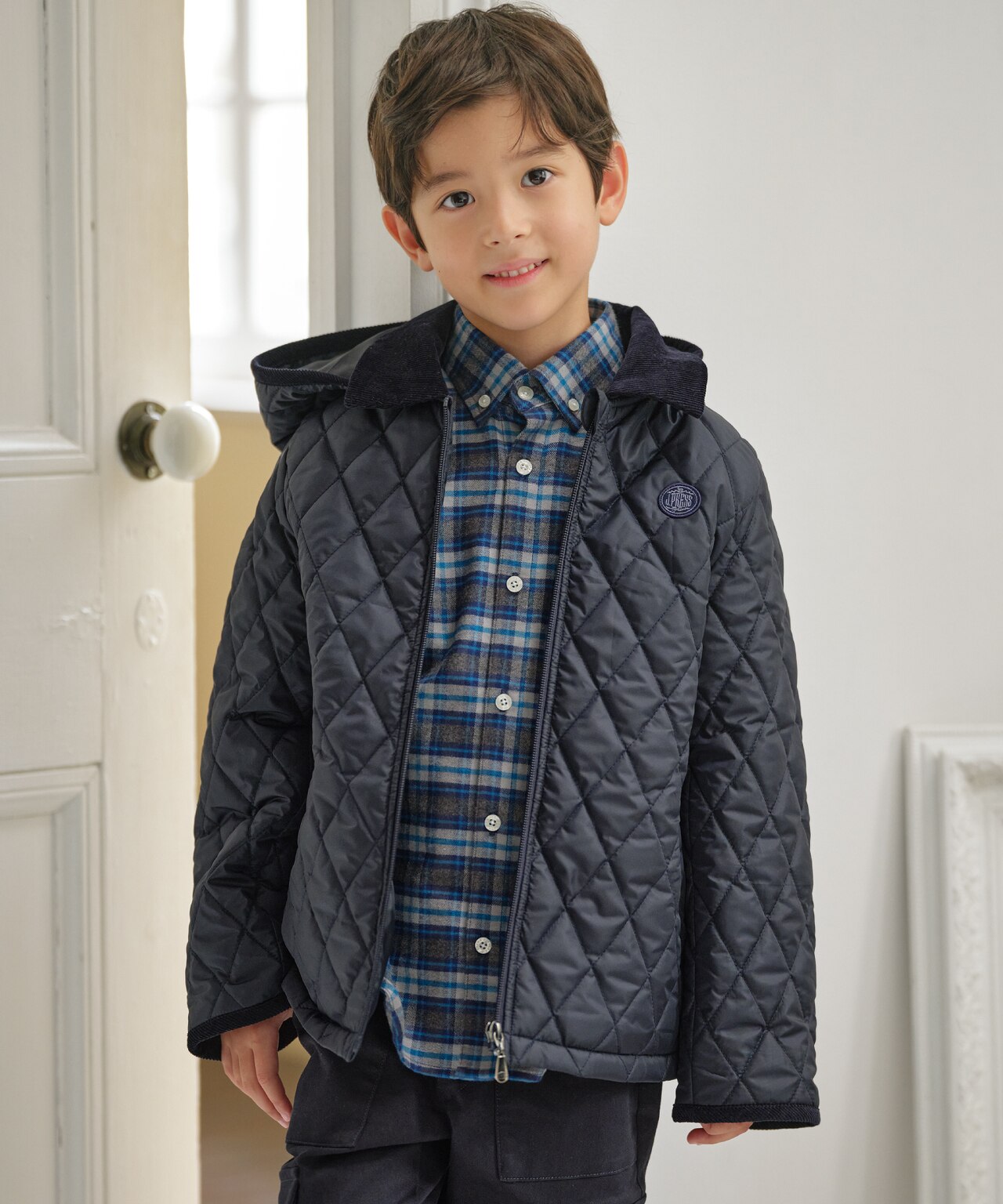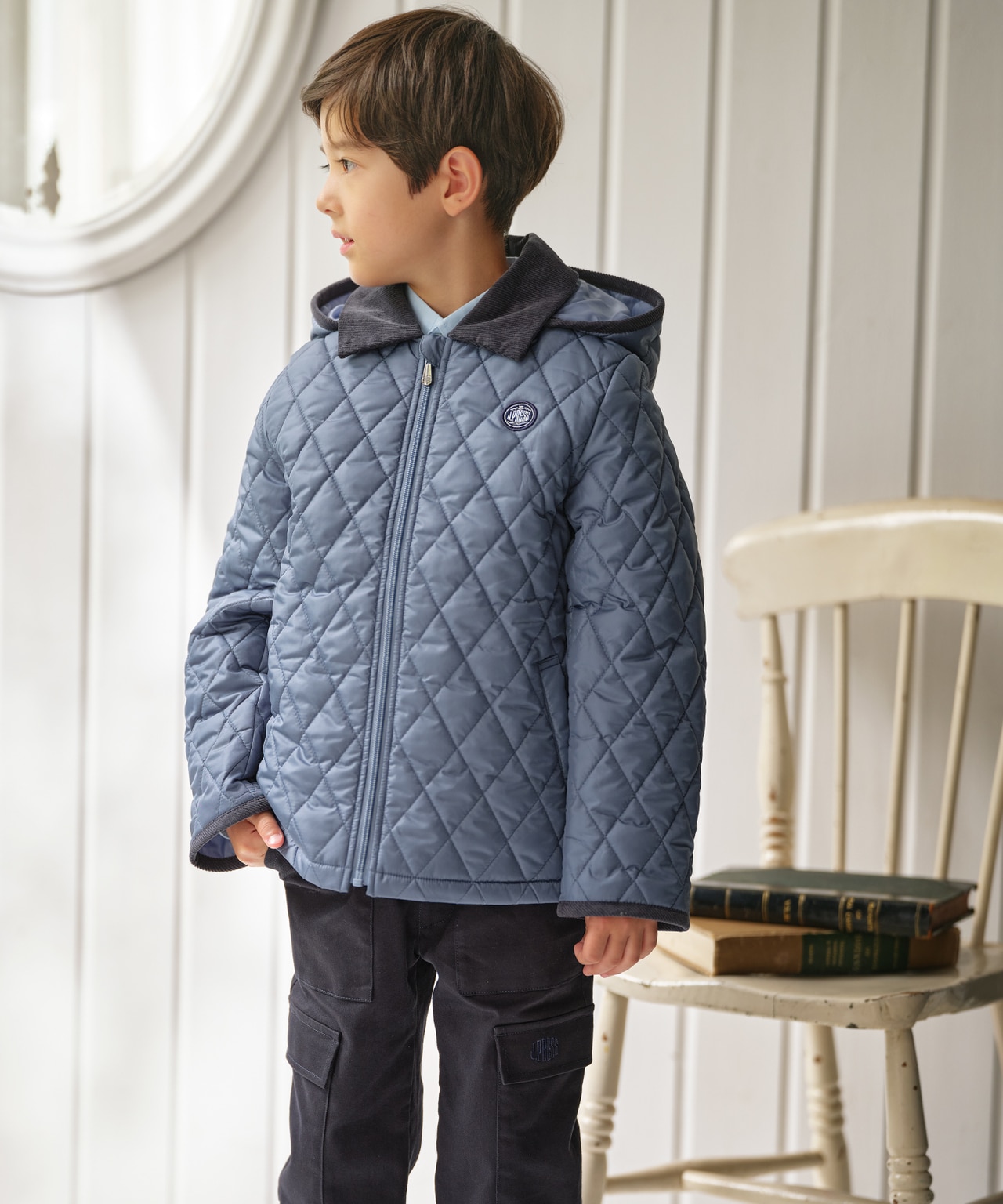 コーデュロイ生地の襟がついた、高級感のあるキルティングアウター。着ぶくれしにくいすっきりとしたシルエットとさっと羽織れる軽さが魅力。取り外し可能なフード付きで、シーンに合わせてカジュアル/フォーマルのアウターとして大活躍!後ろ見頃には反射テープを施し、夜間のお出かけも安心して着用できる一着♪