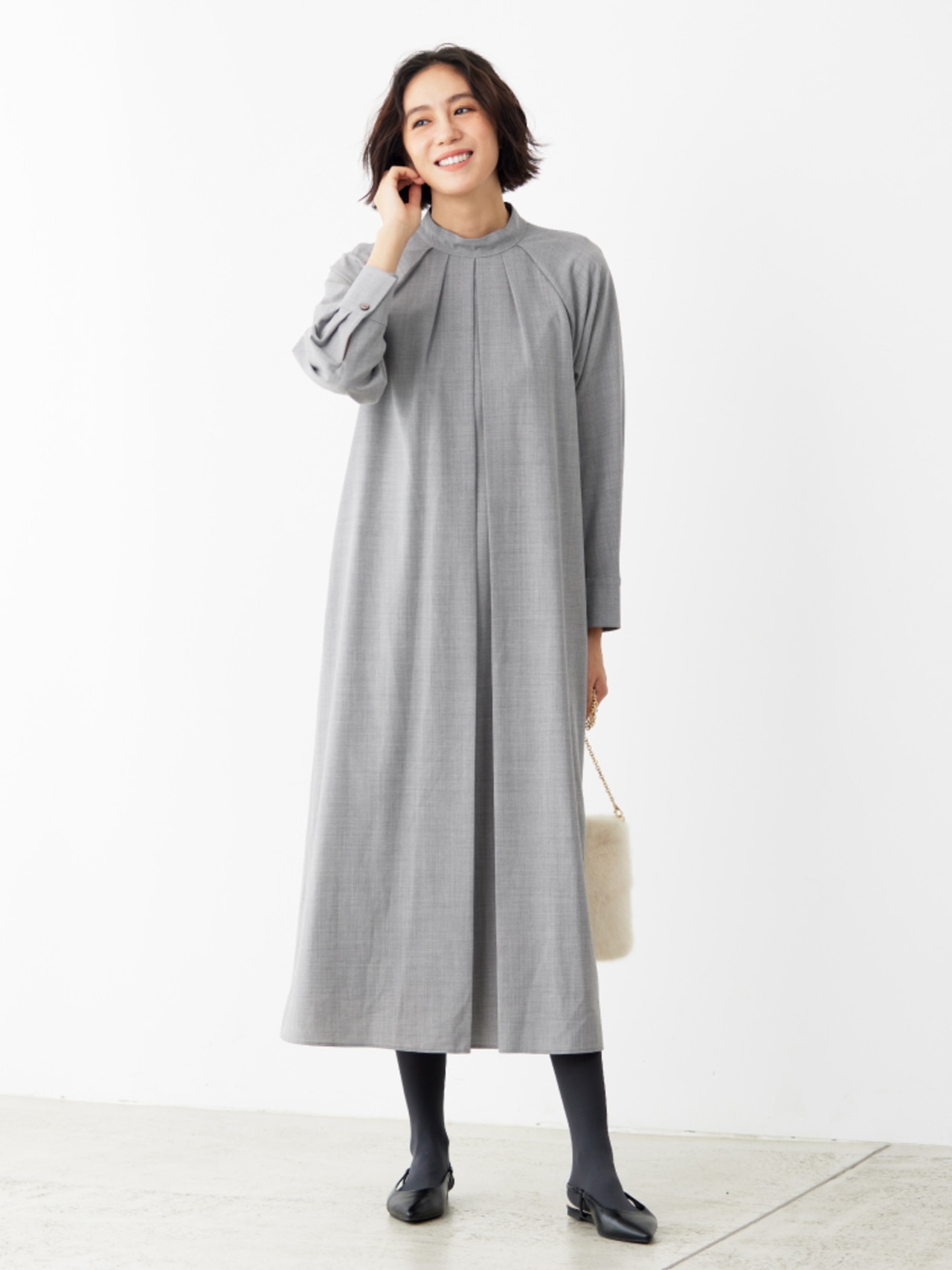 立体的なタックがふんだんに入ったAラインのスタンドカラードレス。