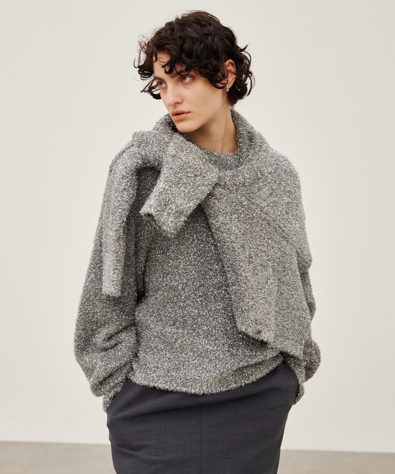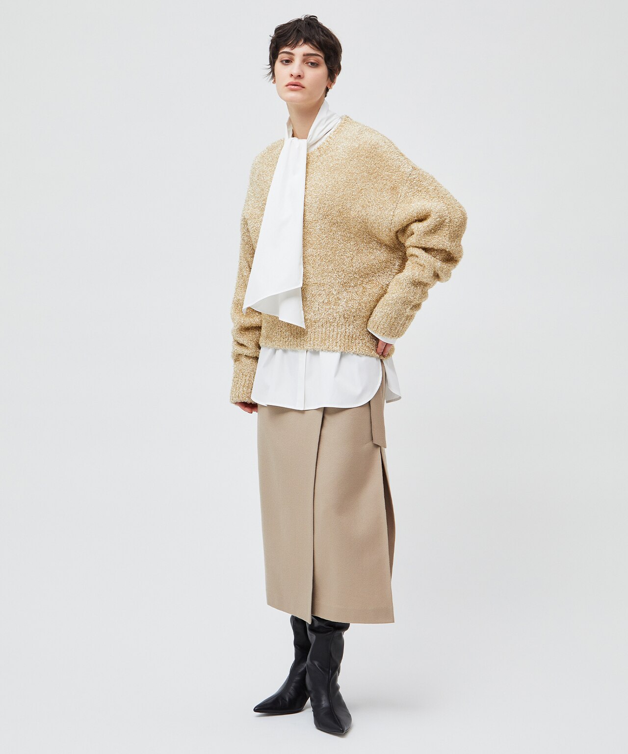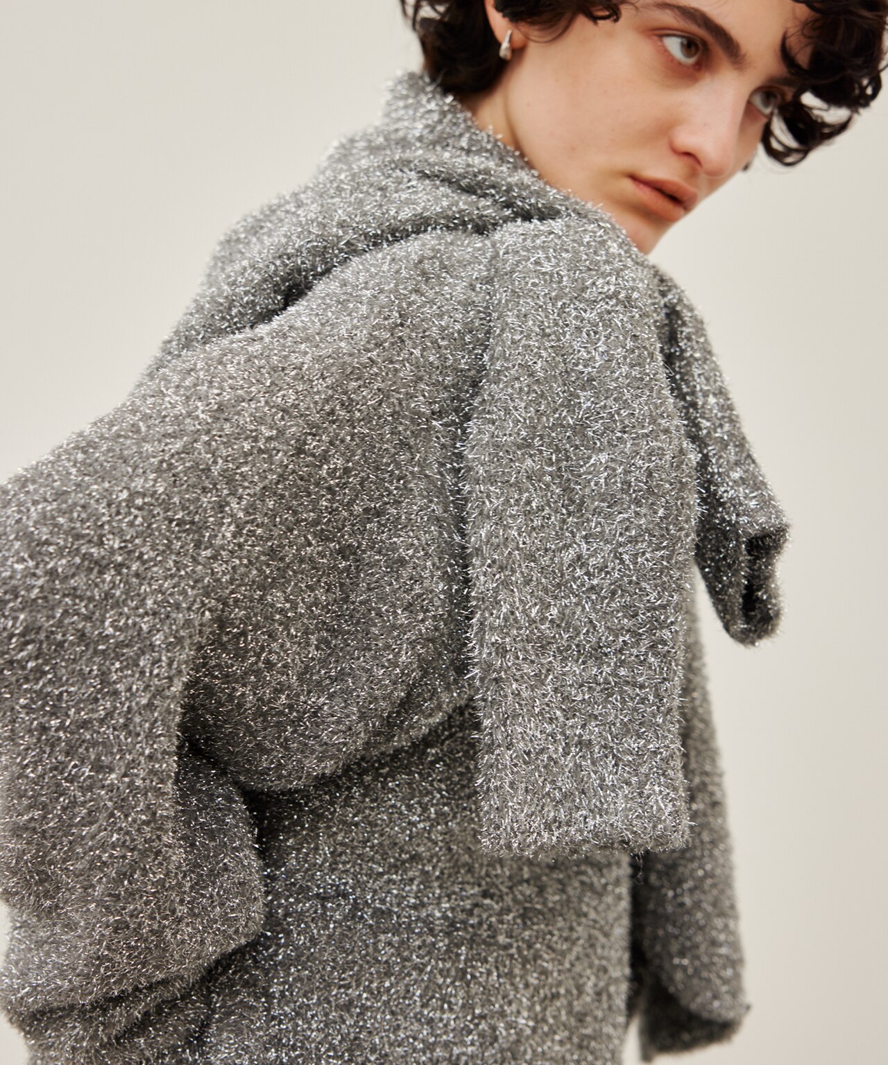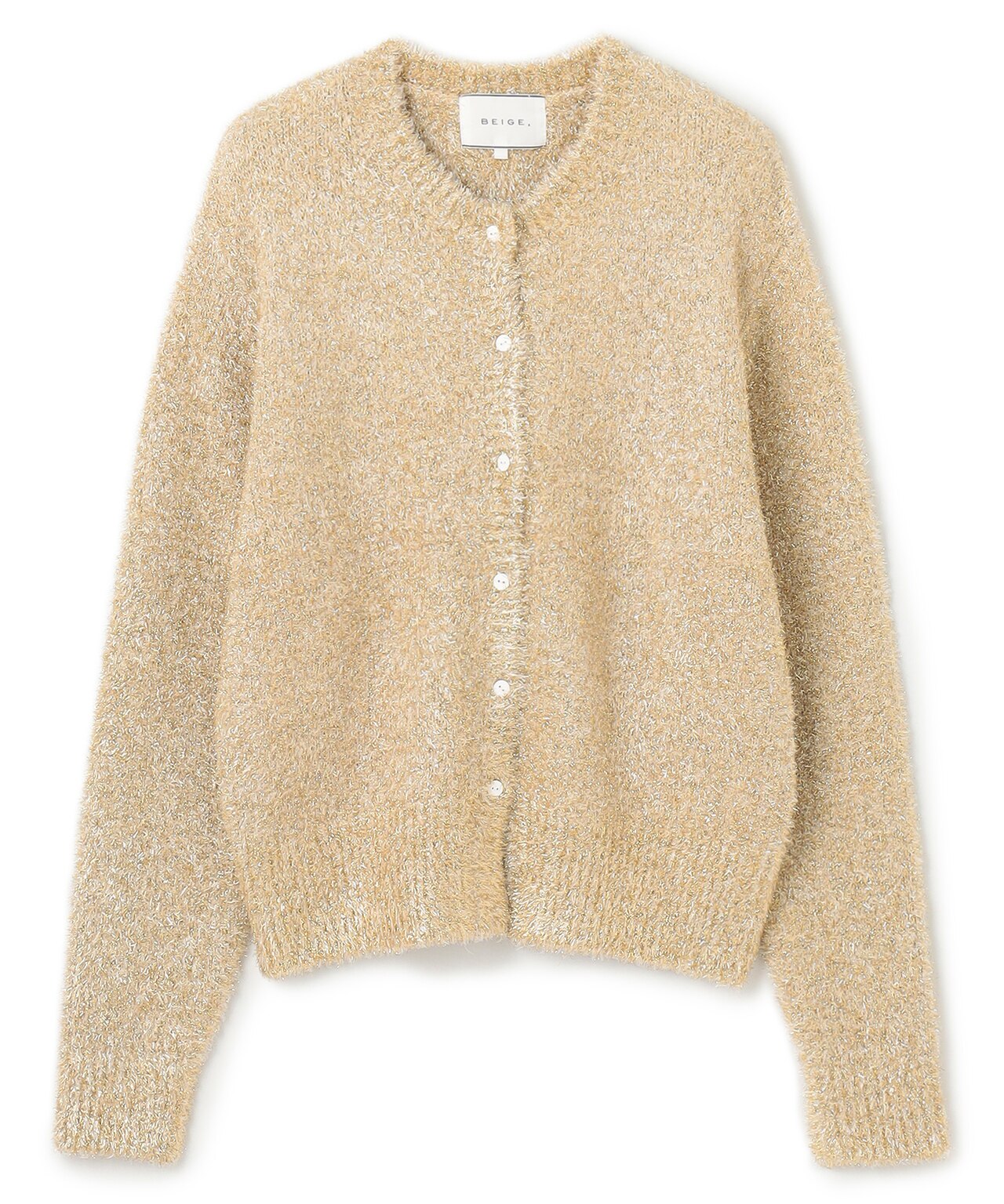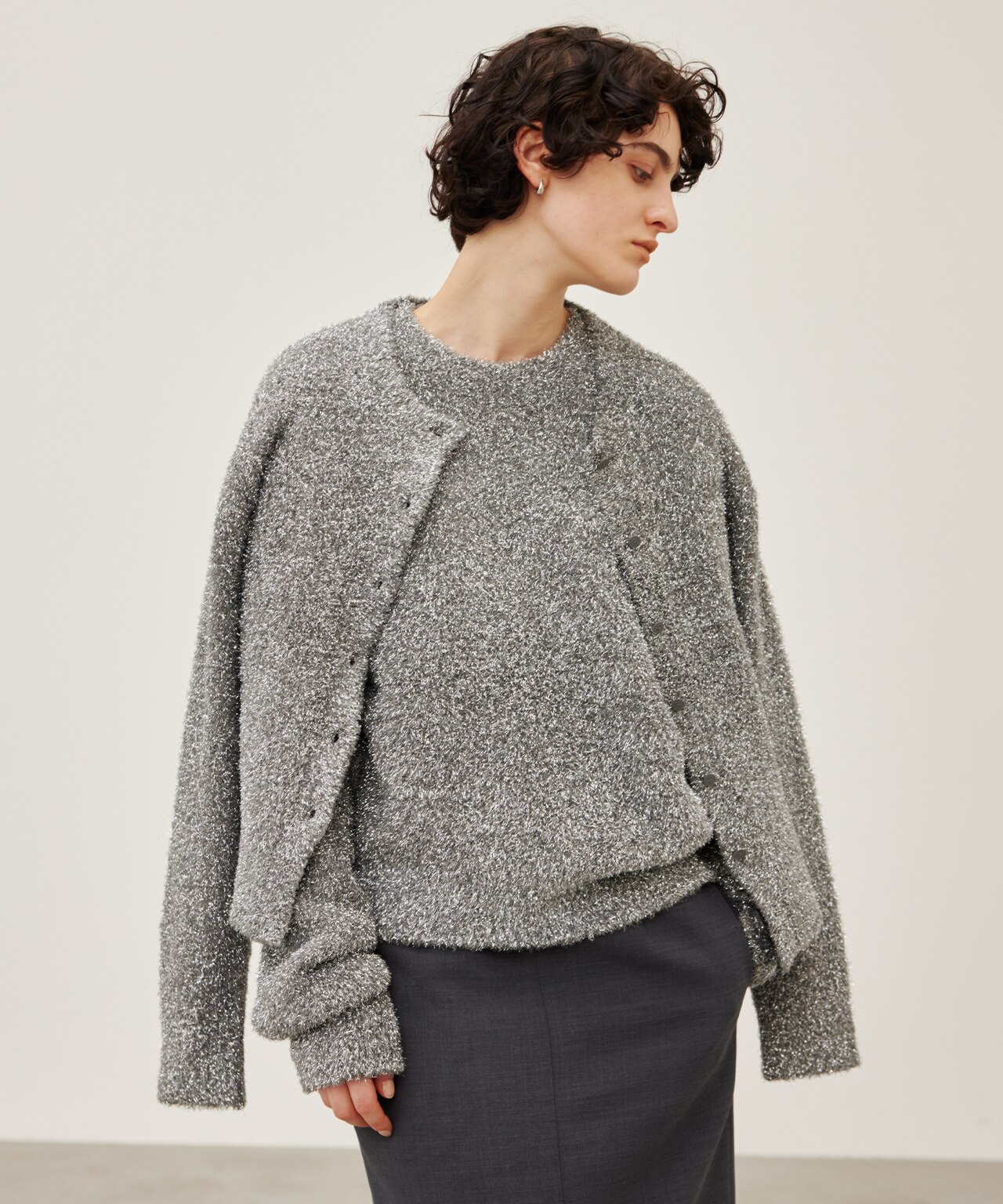ふんわりと軽い着心地で、重ね着もしやすい程よいゆとりのあるカーディガン。羽織りとしてはもちろん、釦を閉めてプルオーバーとしても着回しが効き、煌めく素材がラフに気映えるニットです。