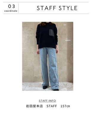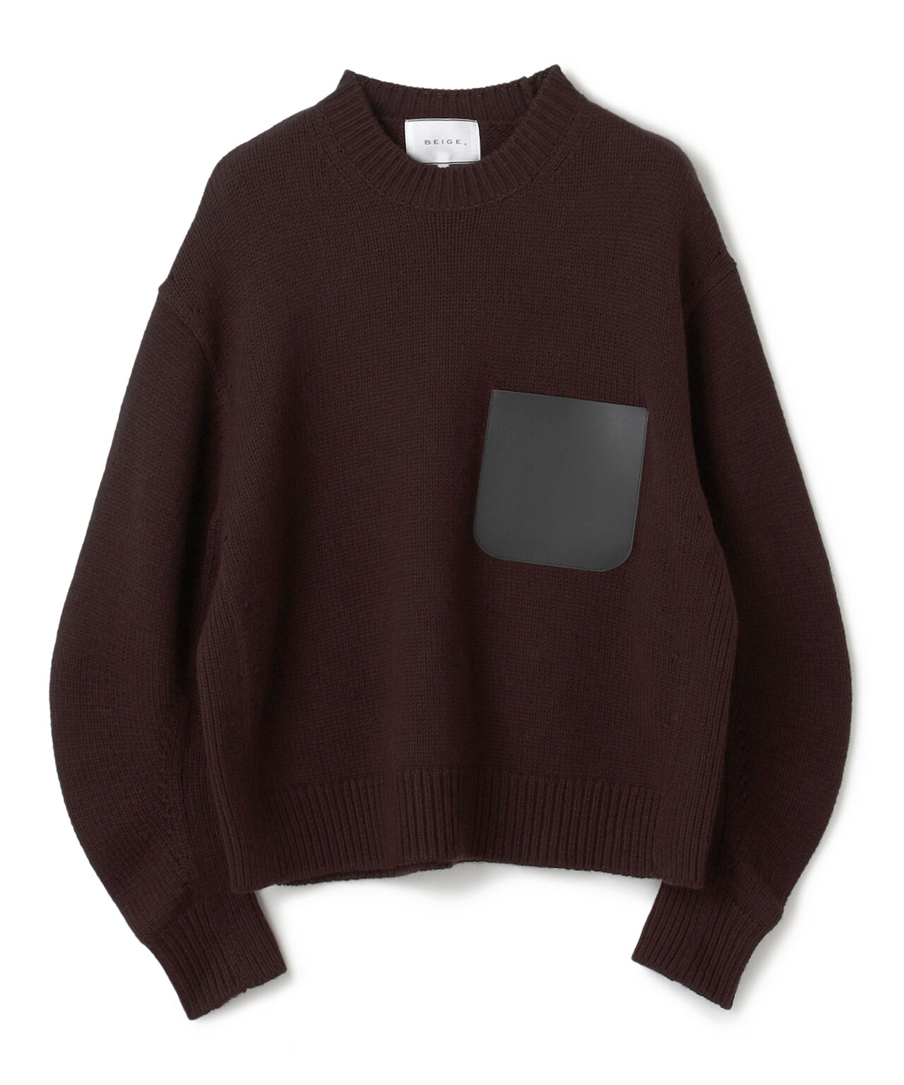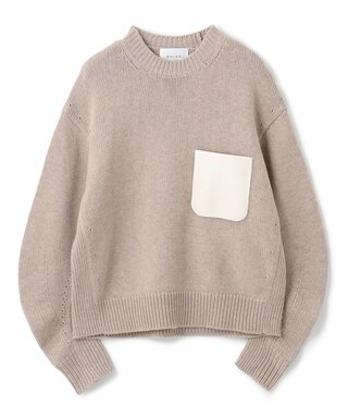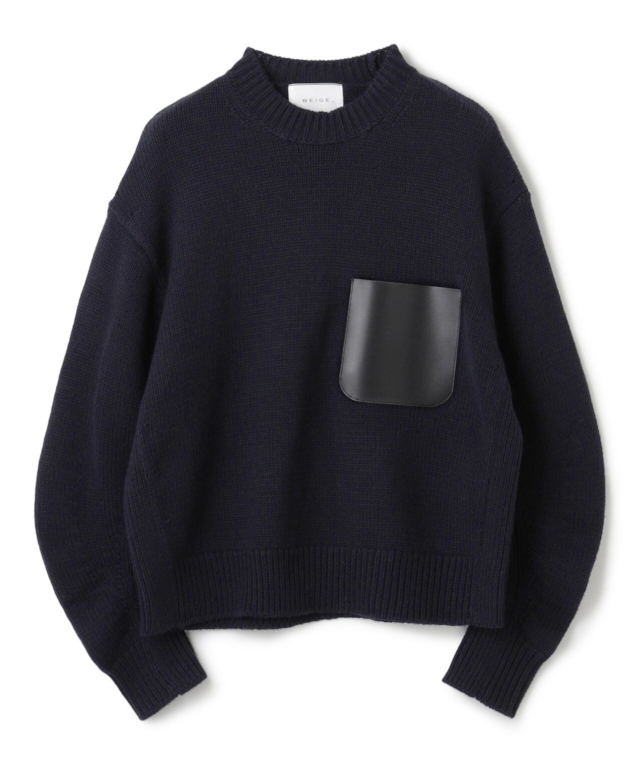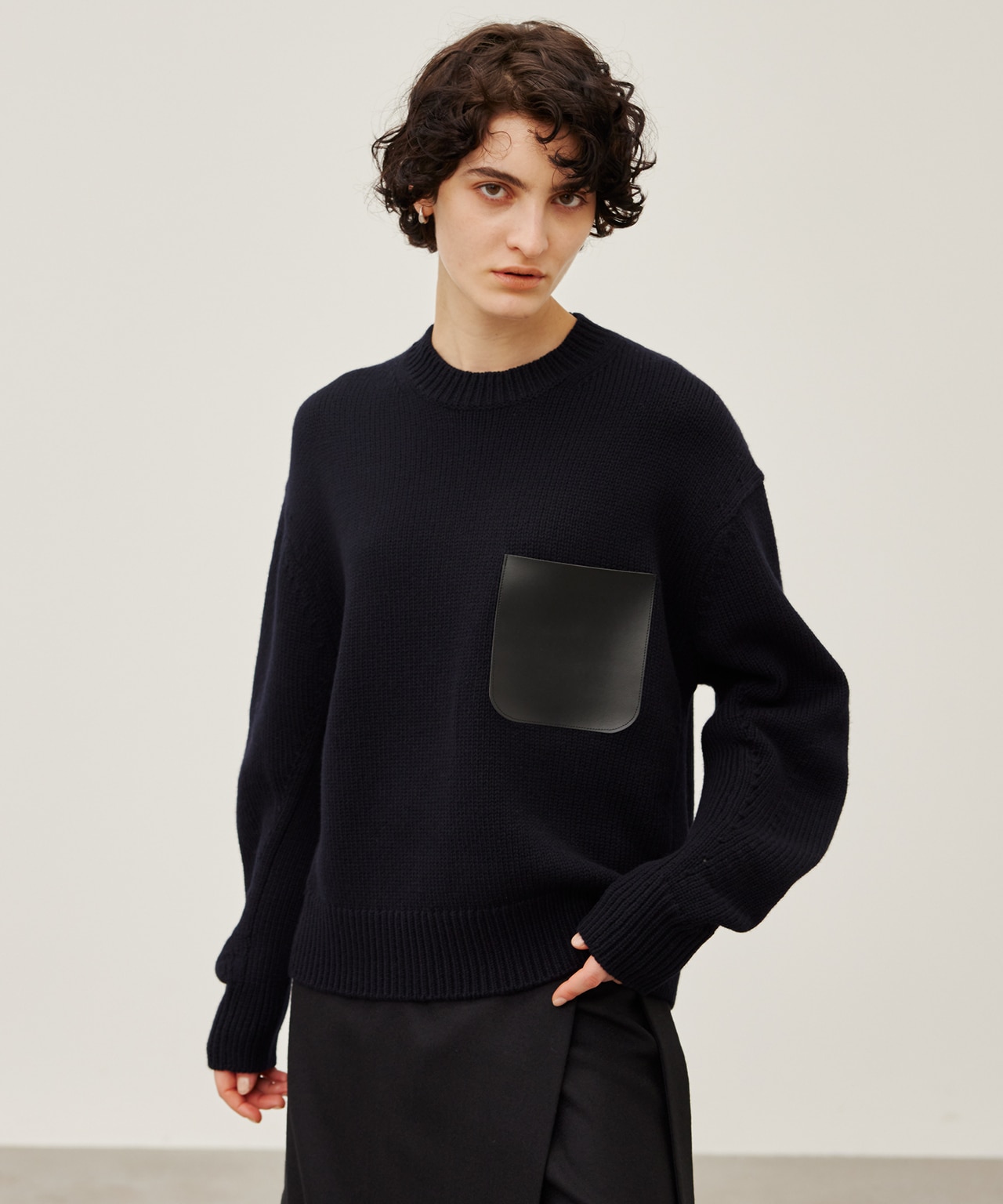短めのざっくりとした着丈のクルーネックニット。シンプルなシルエットながら、胸のフェイクレザーポケットがエッジの効いたデザイン。ニットならではの丸みのあるシルエットが、ニュアンスを与え、ワイドパンツやタイトスカートなど幅広いシルエットボトムに合わせられます。程よい厚みでカットソーとレイヤードしたり、コートのインナーとしても暖かく秋冬コーデを楽しめるニットです。