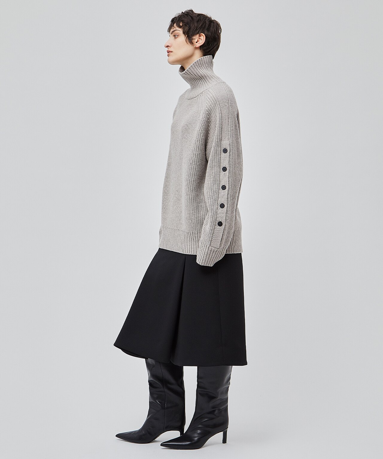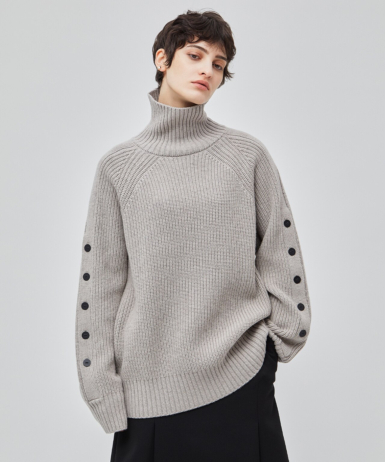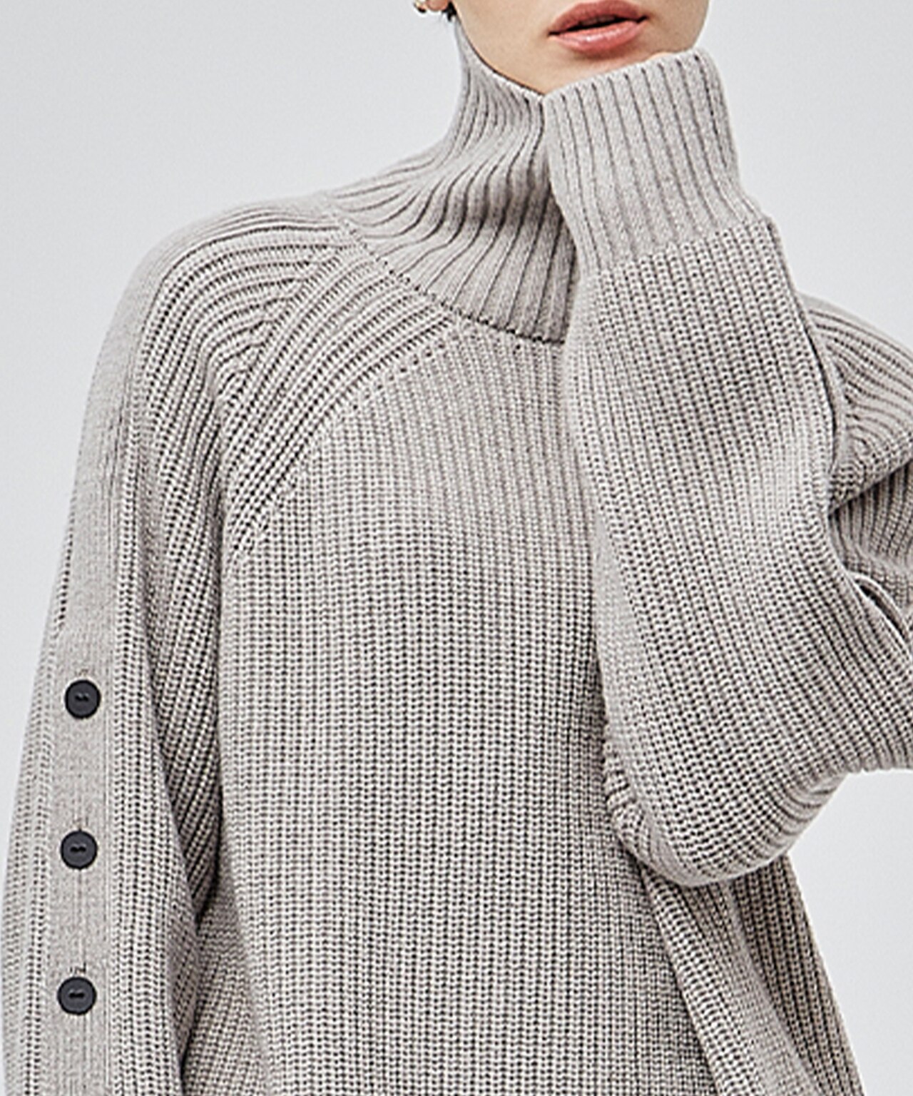 オーバーサイズのゆったりとしたサイズ感がベーシックなボトムに合わせても洒落感の出る、リュクスなデザイン。そのままや両袖のボタンを外しスリットのようにインナーや素肌を見せて着こなすのもおすすめです。シンプルながらアレンジを楽しめ、着る人の個性を引き出すデザインニットです。