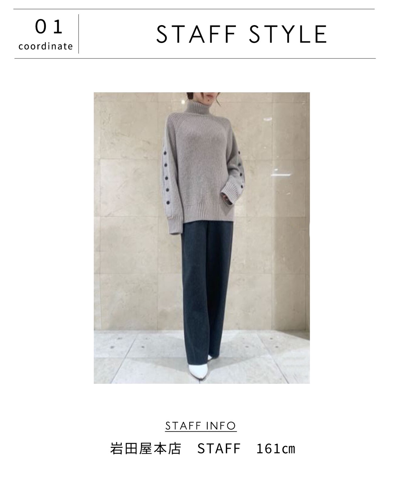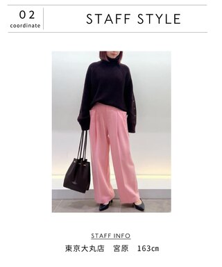 昨年に引き続き好評のウールパンツは、機能性と美脚を備えた優れもの。ウエストゴムの楽チンさと保温性のあるウール地で、冬に大活躍。ざっくりニットを合わせ、大人のリラックスカジュアルに。