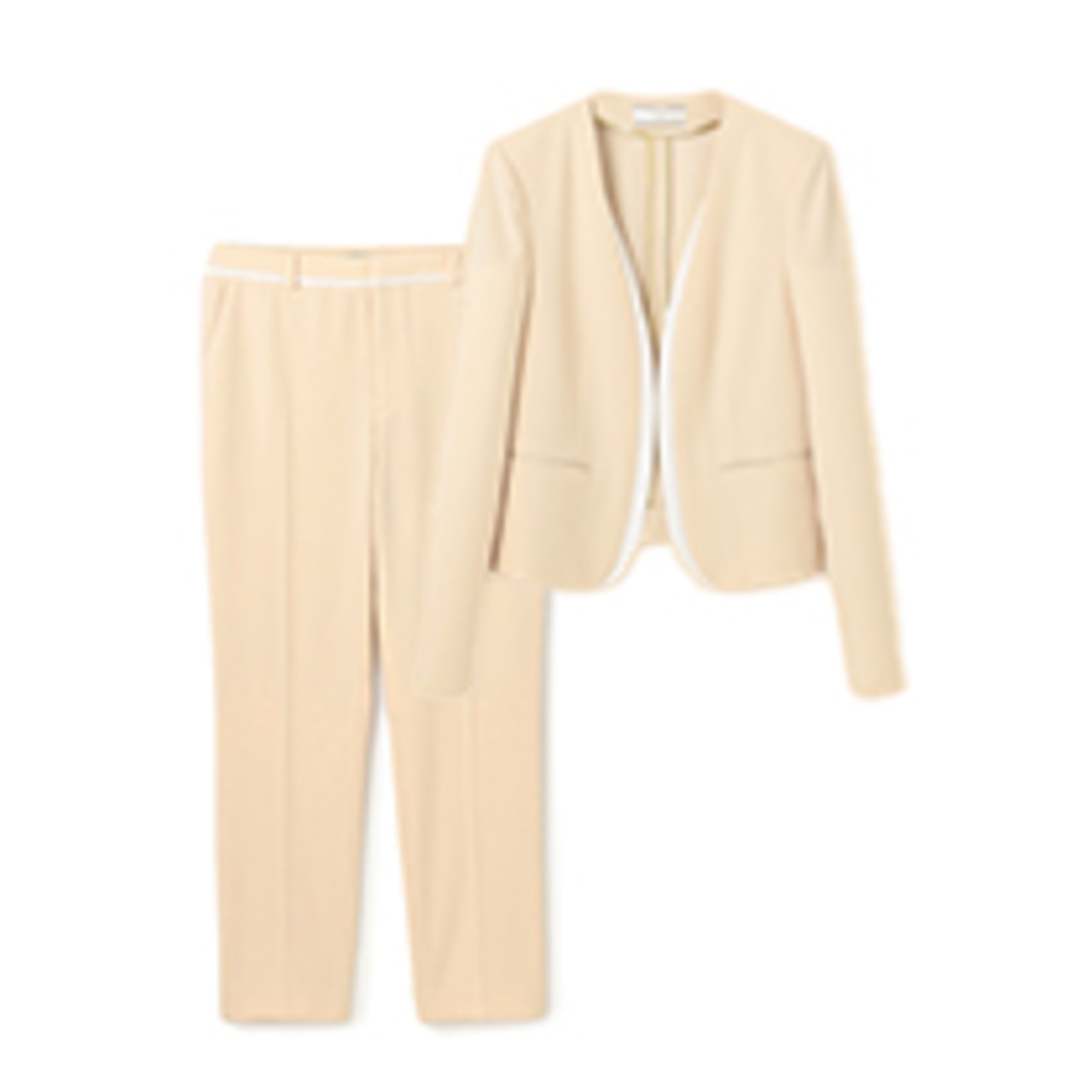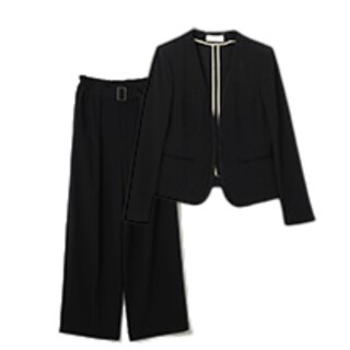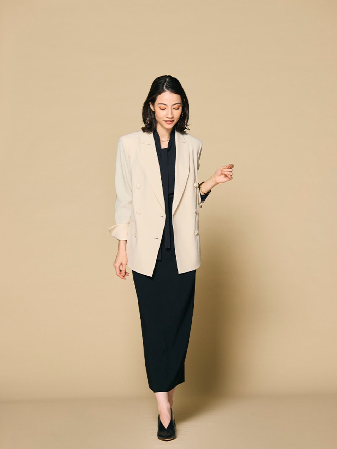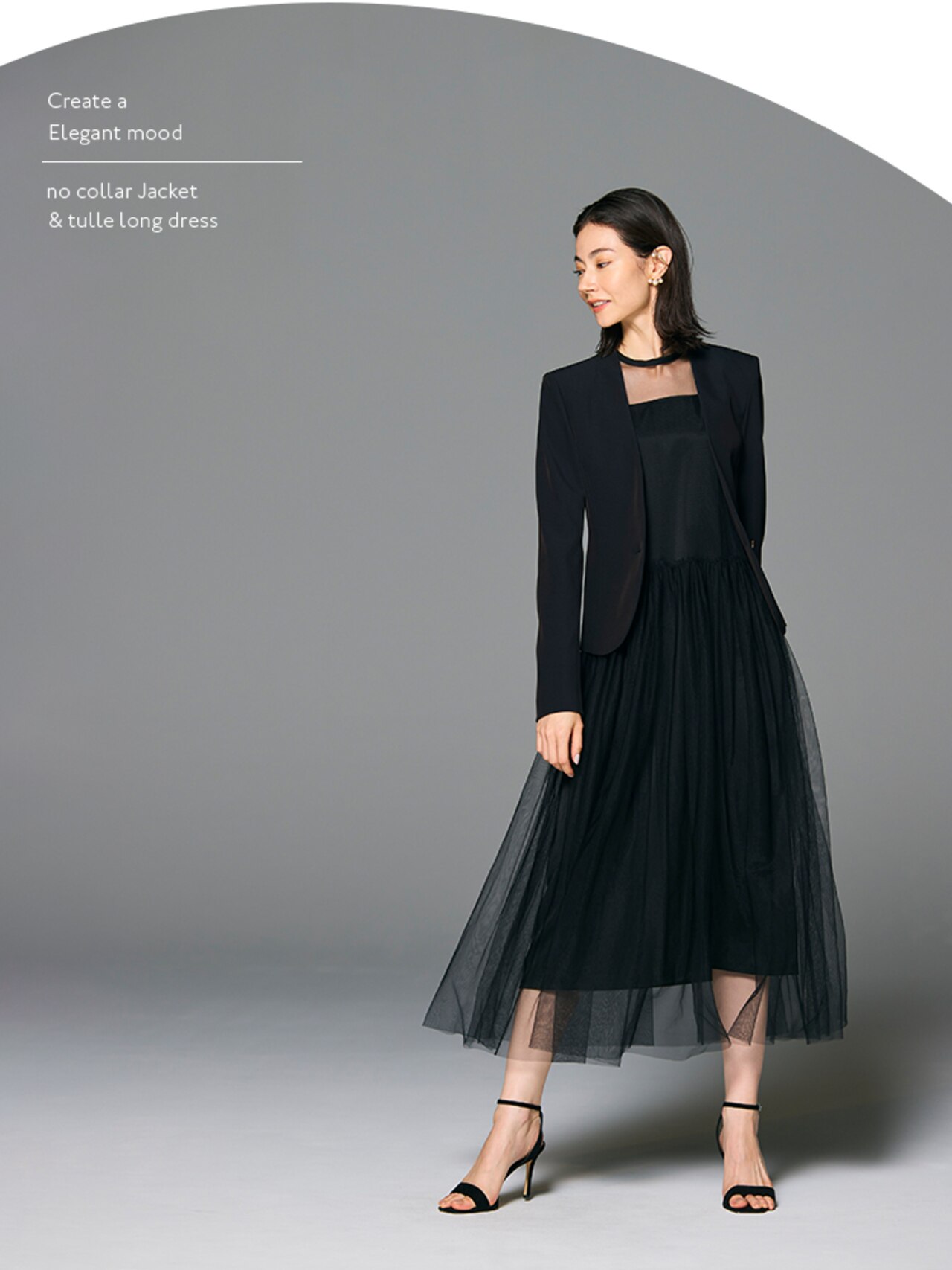 特にストレッチがきいているジャケットは、ストレスフリーでしわになりずらく、ワードローブに準備しておけば茶会や観劇など、大人の社交シーンに自信をもって着まわせます。ノーカラーのジャケットは、着回しがしやすいのもポイント。