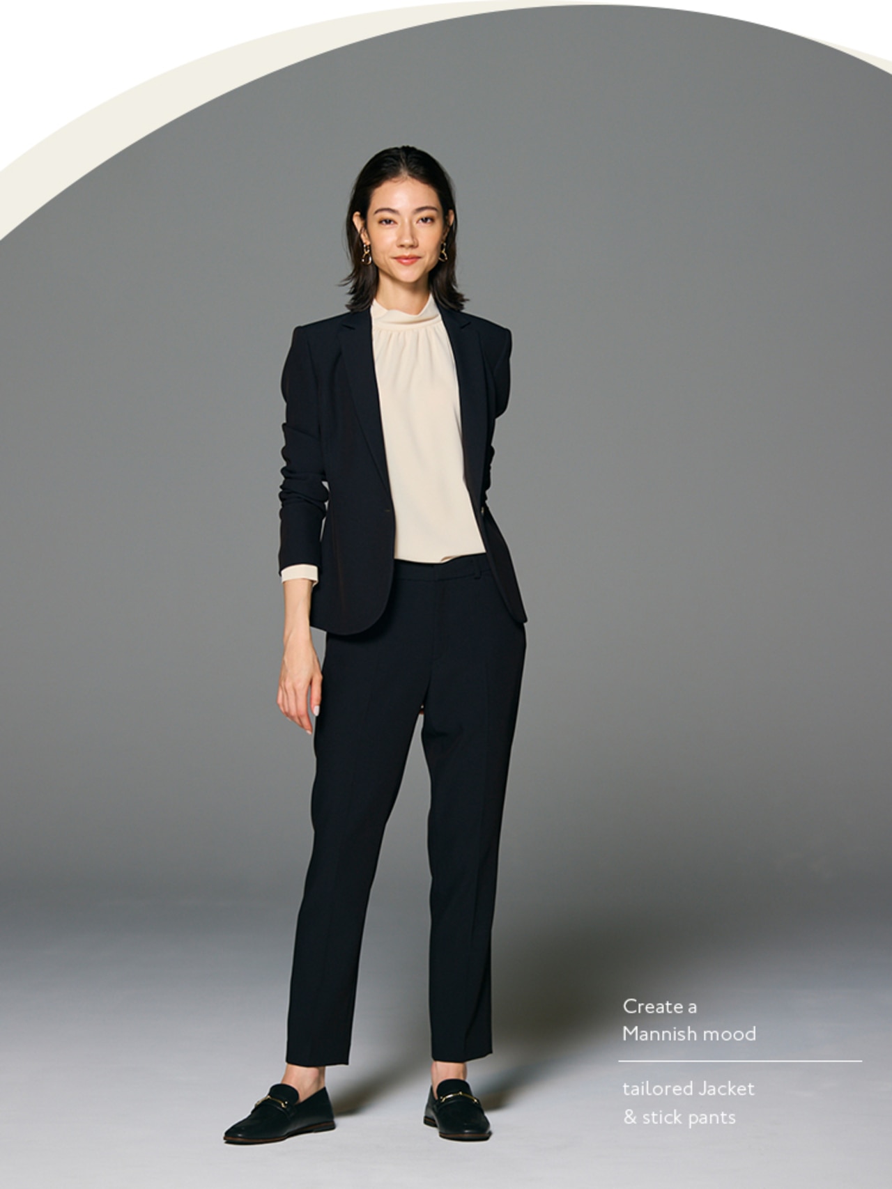 会議や商談できりっとした印象をあたえたいときには、テーラードがおすすめ。セットアップできちんと感は出しながら、シフォンやギャザーで着飾れば、高級感のある上品な雰囲気に。そのままビジネス会食にも参加できます。