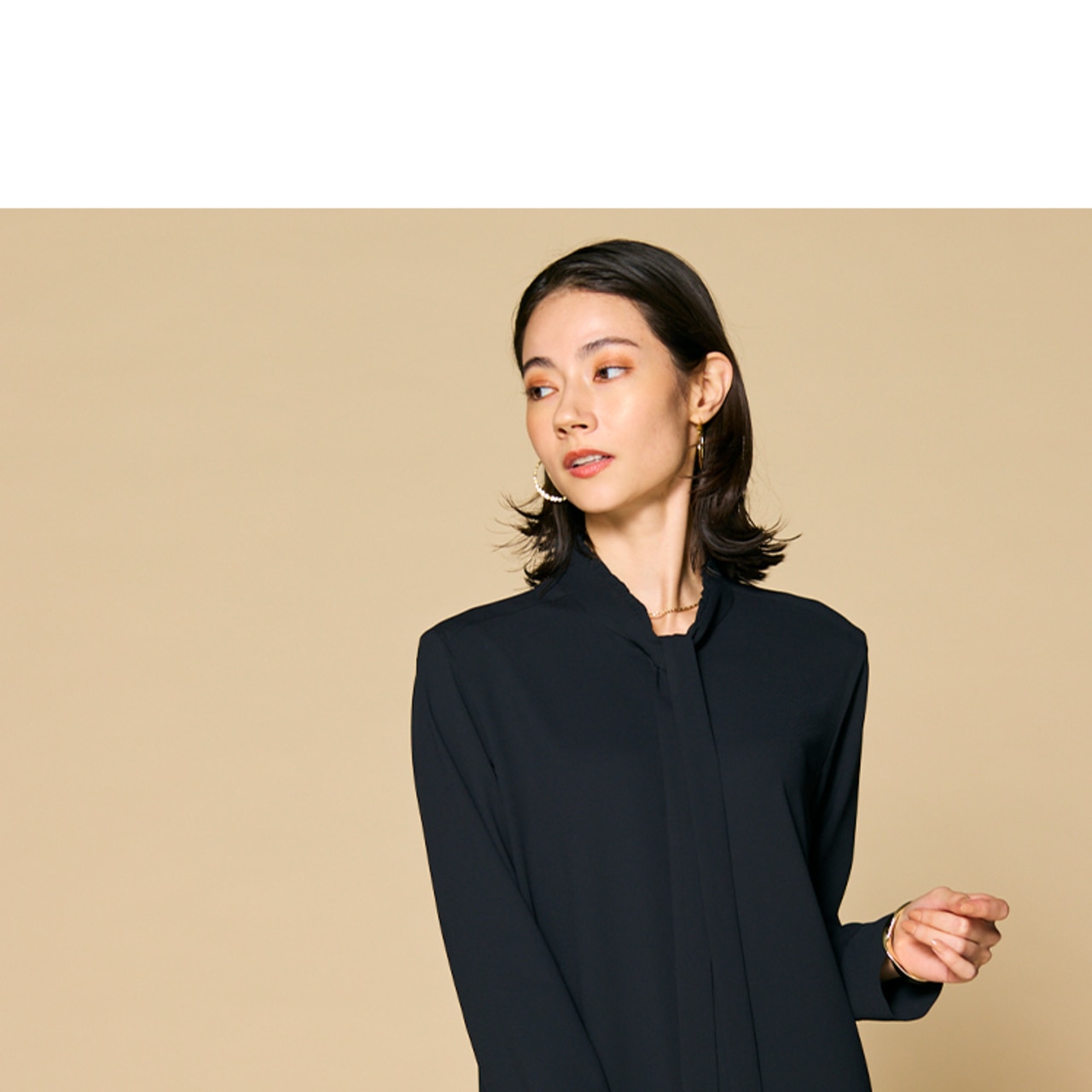 ≪BEIGE,人気のとろみブラウス≫しなやかなストレッチ素材が心地よく、飽きのこないシンプルなデザインながら、上品さ漂うシャープなシルエット