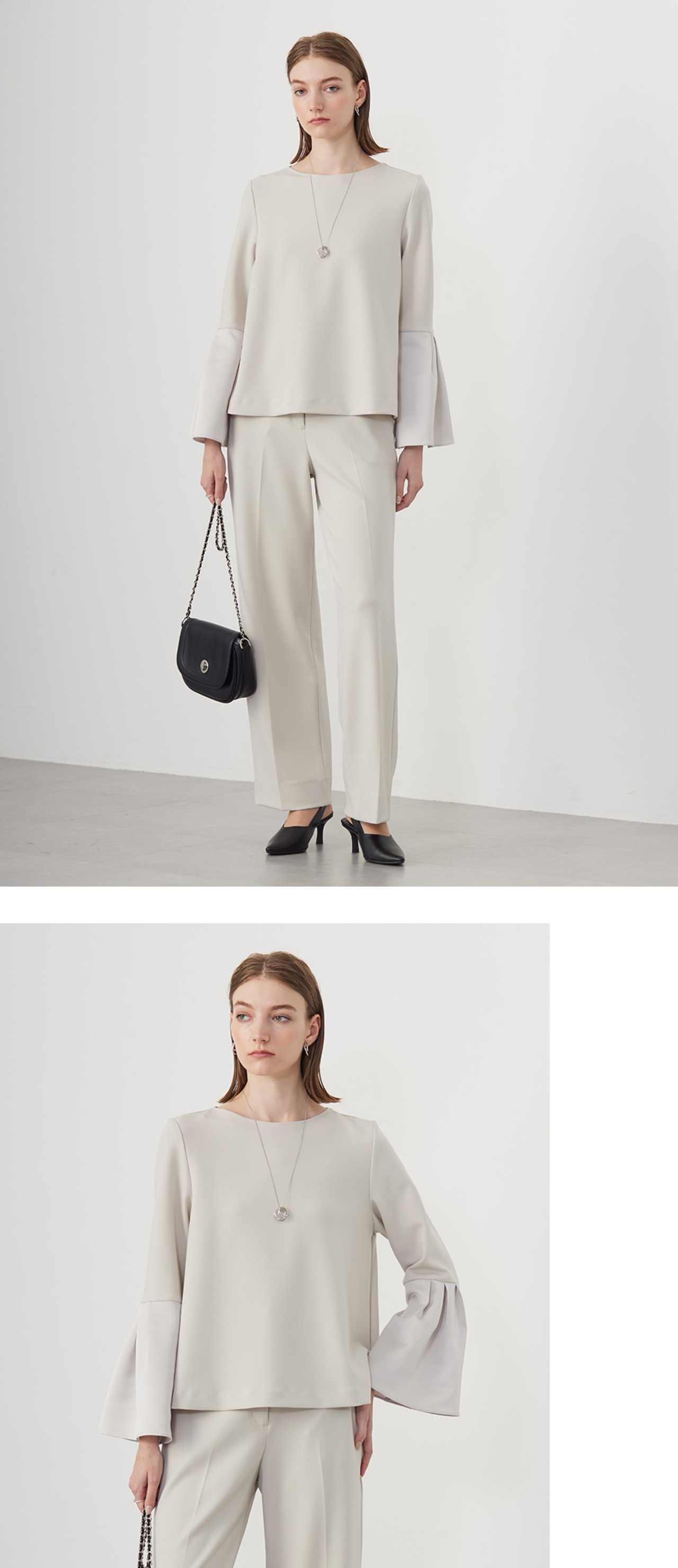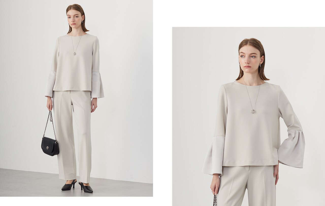 適度に反発感があり、仕立て映えするハイゲージダンボールニット素材を使用したミリオーネダンボールニットシリーズ。セットアップ可能な異素材コンビブラウス、ワイドストレートパンツと、ベアトップワンピースの3型展開です。