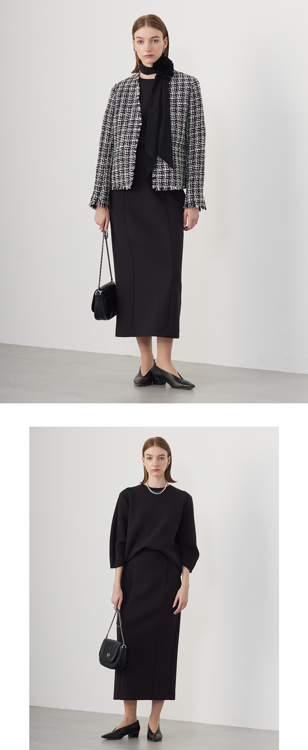 スパンコールやテープヤーン、モールなどのファンシーヤーンをふんだんに使用した、スパングルツイードシリーズ。取り入れるだけでトレンド感も華やかさも叶うツイード素材で、ノーカラーコートとジャンパースカートをつくりました。