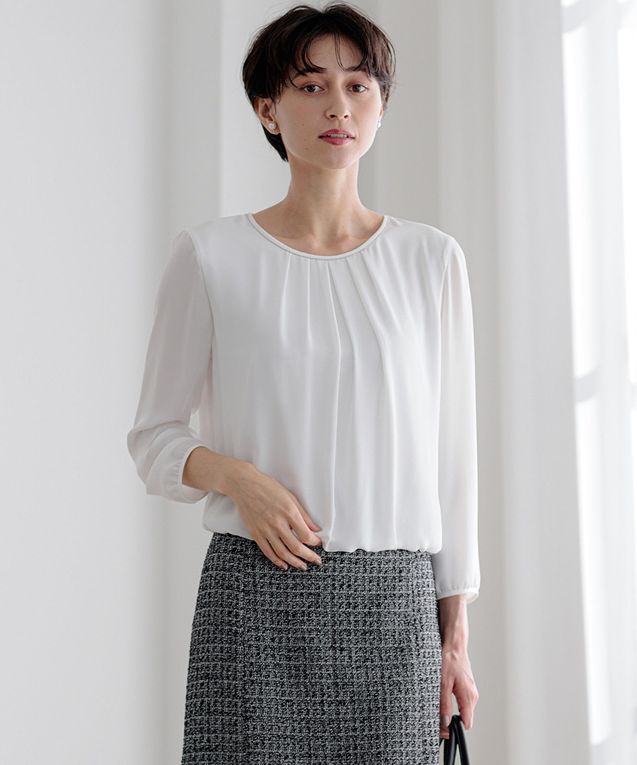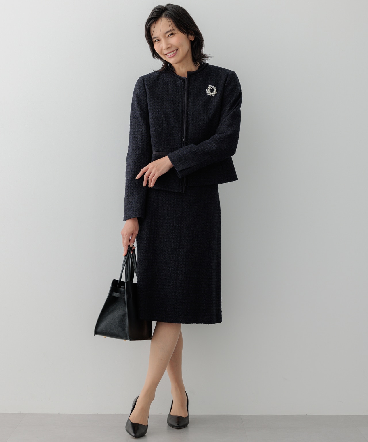 品の良いツイード素材のセットアップはセレモニーにぴったり。きれいめな雰囲気なのにストレッチ性があり、動きやすさにもこだわったシリーズ。同シリーズのコサージュを着ければ、洗練された気品が漂う。インナーには、セットアップのデザインが引き立つシンプルなカットソーがおすすめ。