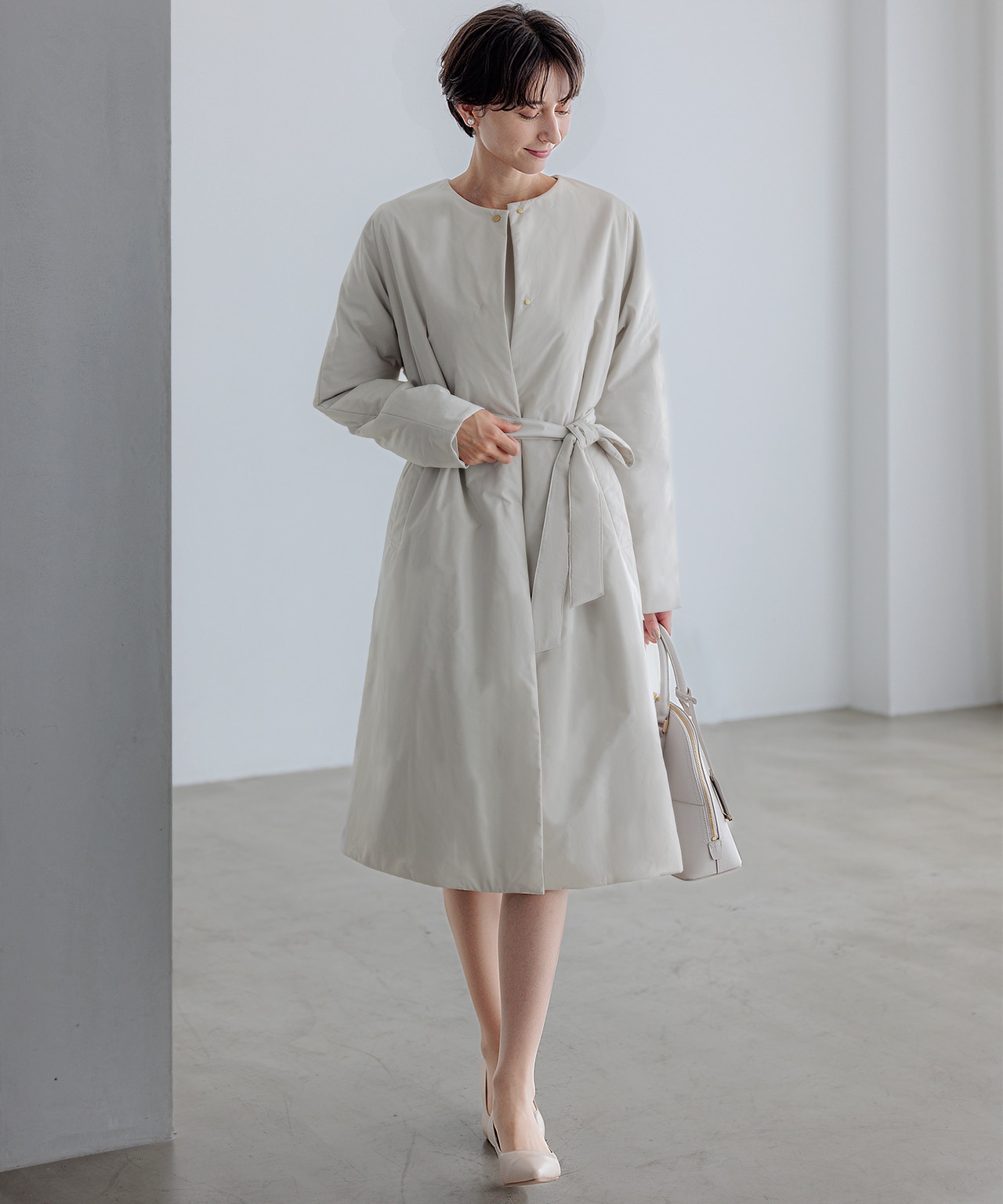 一見シンプルなワンピースは、腕を動かす際に袖スリットからピンタックプリーツシフォンが覗くデザインが華やか。さらに、袖口にあしらったパールボタンもアクセントに。サック型シルエットで、ほど良くボディラインをカバーできるのも頼れるポイント。肌寒いときにはきれいめシルエットのコートを羽織って。