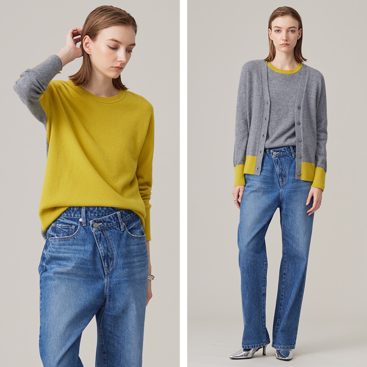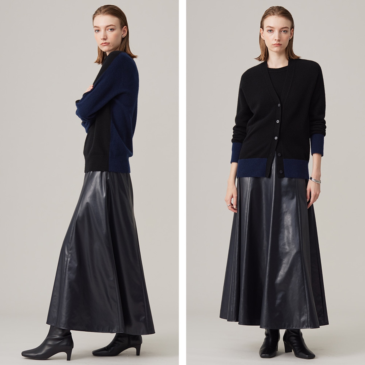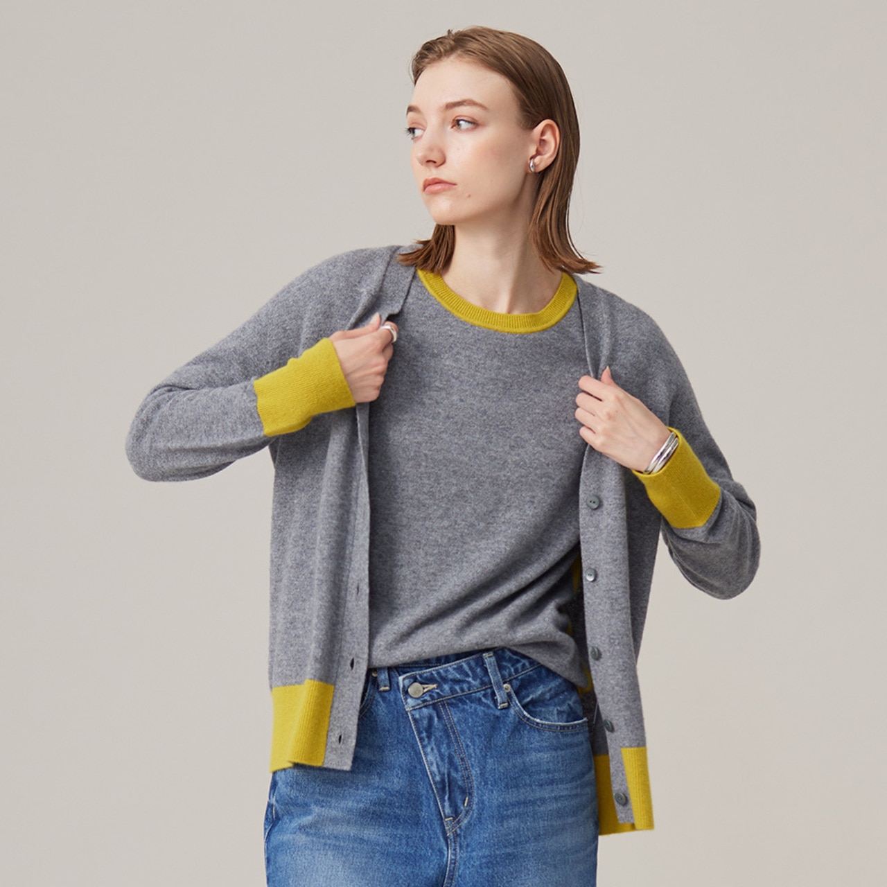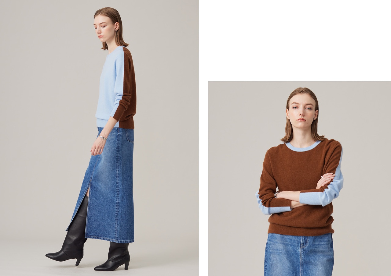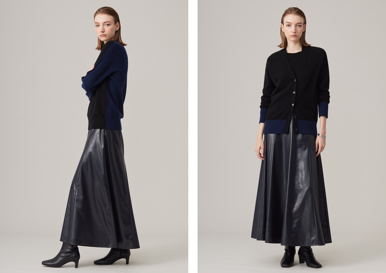 着こなしの洗練度を高める配色デザインもポイントで、前後着用可能なプルオーバーとカーディガンの2型展開です。