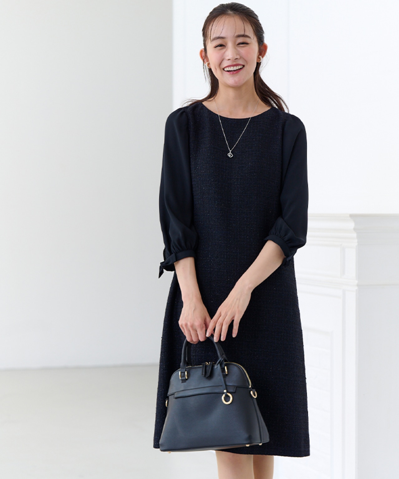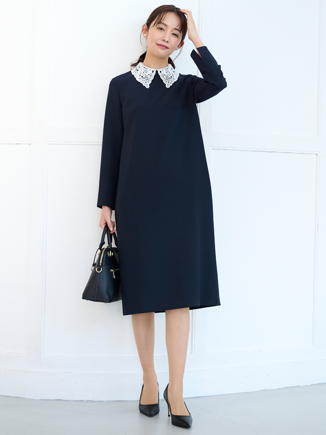 王道のネイビー。デザイン性のあるセットアップやフリル、襟付きなど華やかなアイテムがおすすめです。