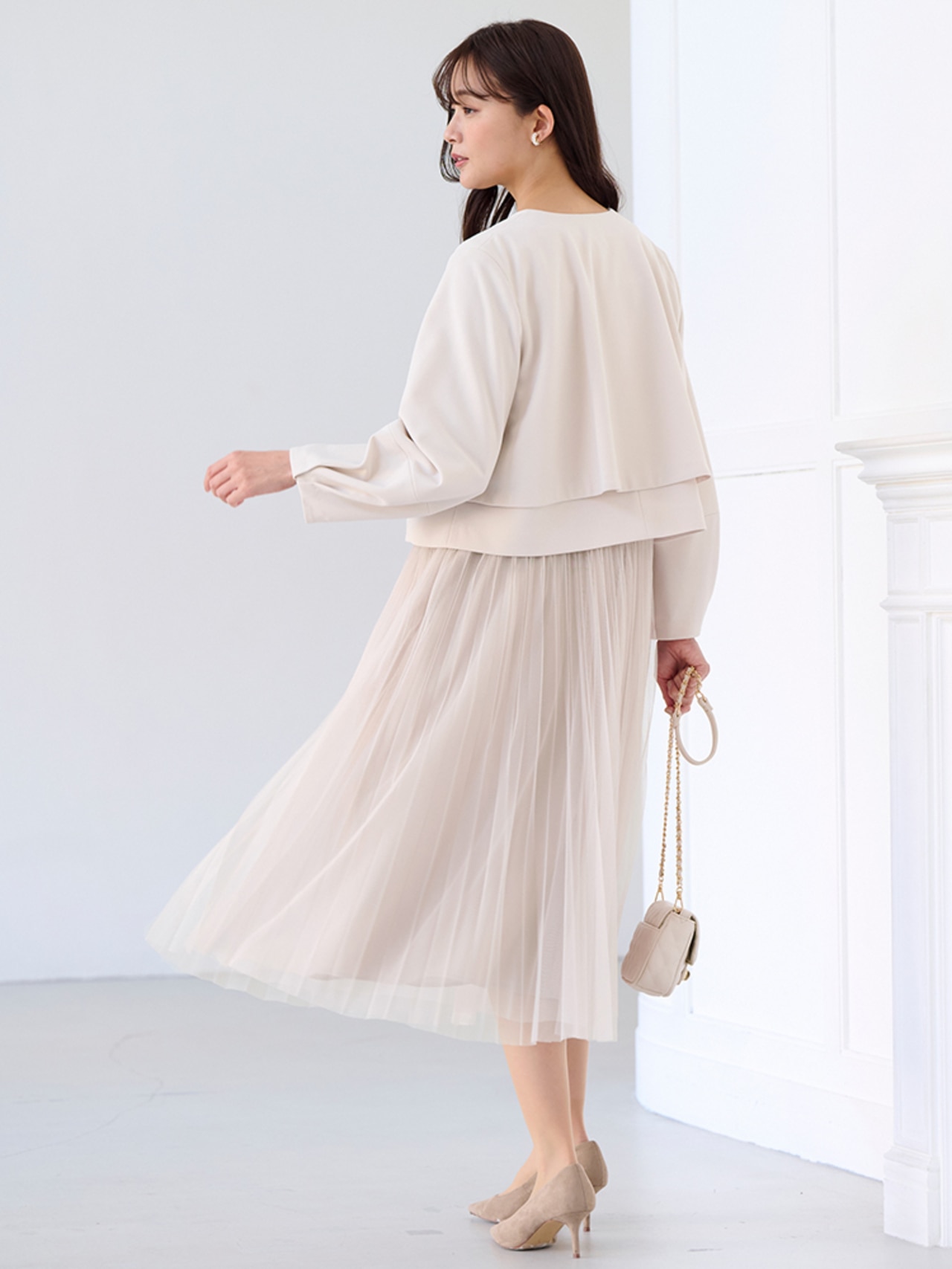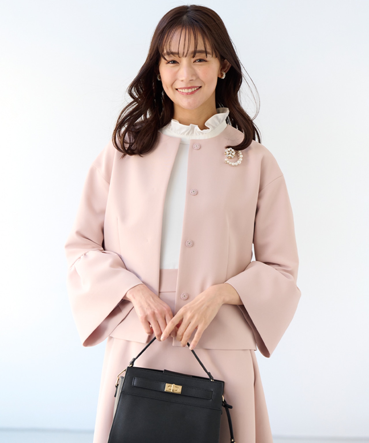 ハレの日にぴったりな華やかセットアップ。インナーのフリルブラウスはニットのインナーとしてもセレモニー以外でも活躍するおすすめアイテムです。