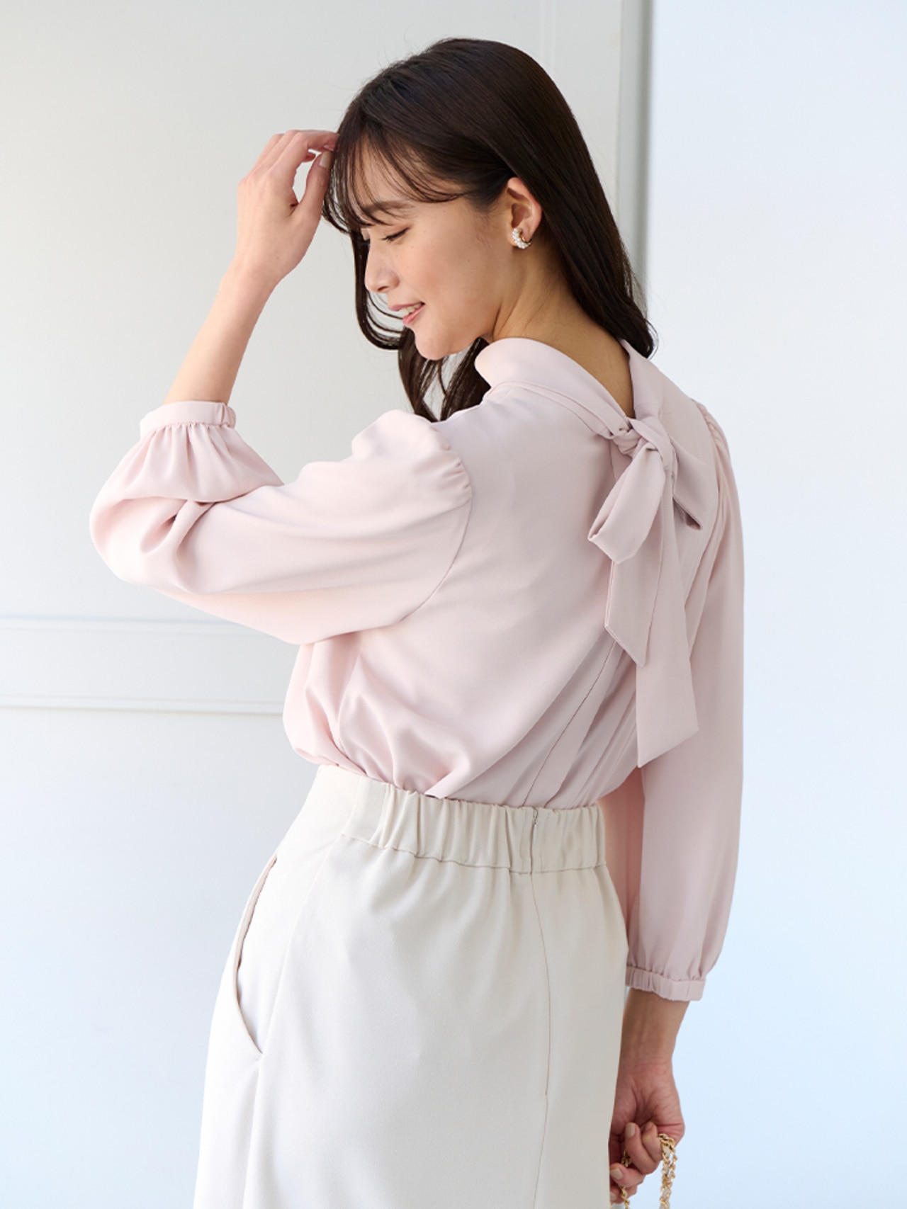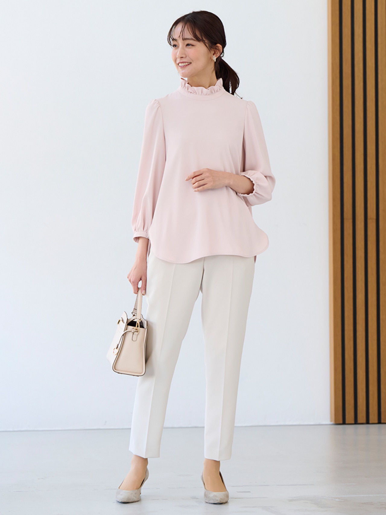 ボウタイブラウスにピンクのセットアップでとことんフェミニンに。美シルエットのテーパードパンツがほどよくモード感を足してくれます。