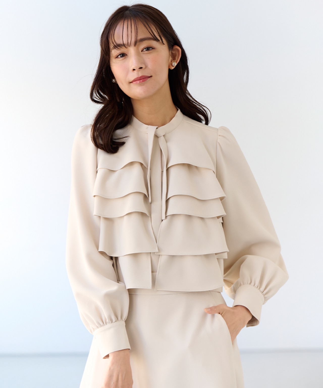 一枚で決まるランダムフリルのティアードブラウス。綺麗めからデイリーまでシーンを問わず着用できる万能ブラウスです。
