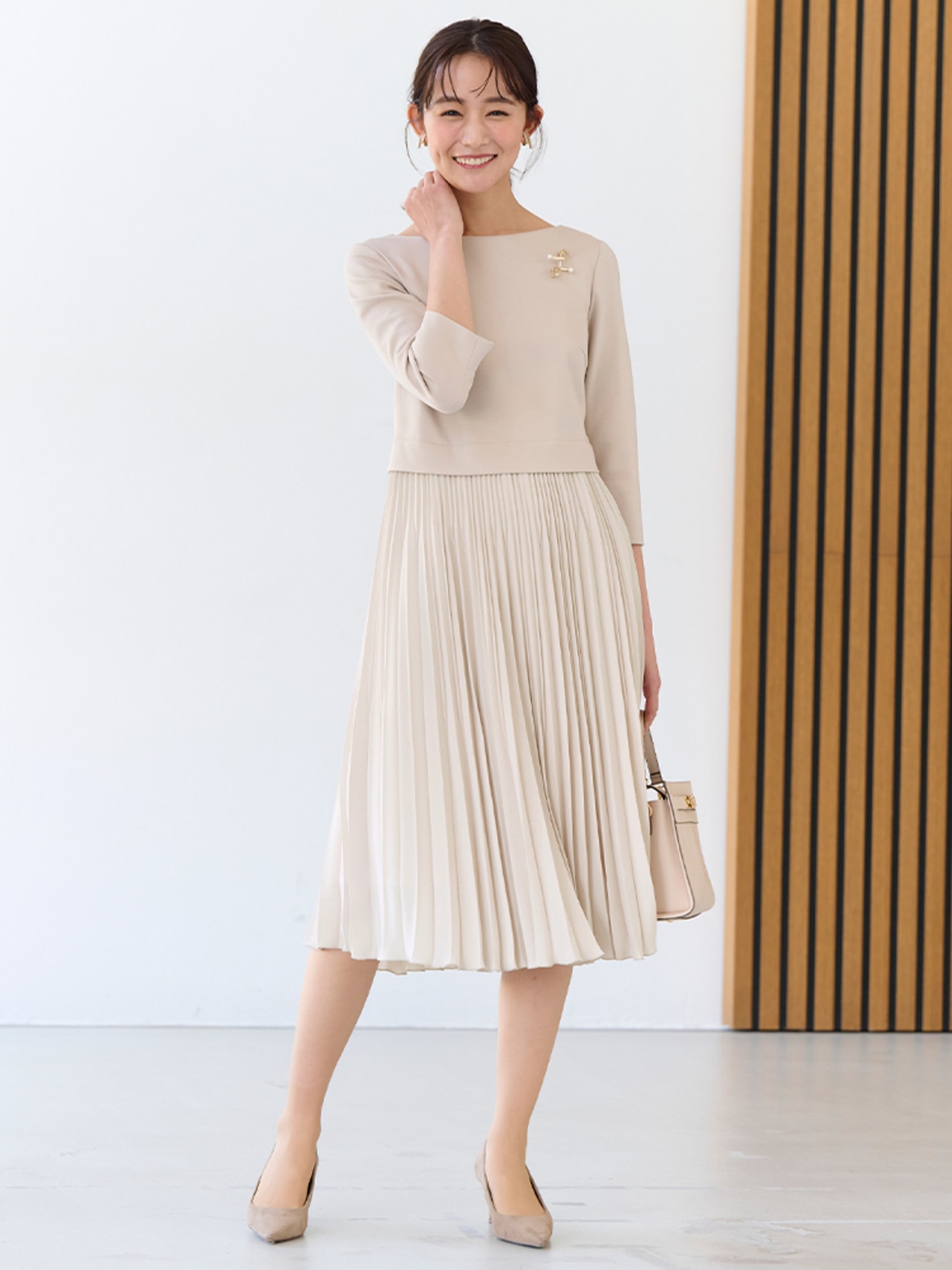 上品さと明るさを兼ね備えた、白やベージュを取り入れたスタイル。かっちりとしたデザインでも柔らかく仕上がります。