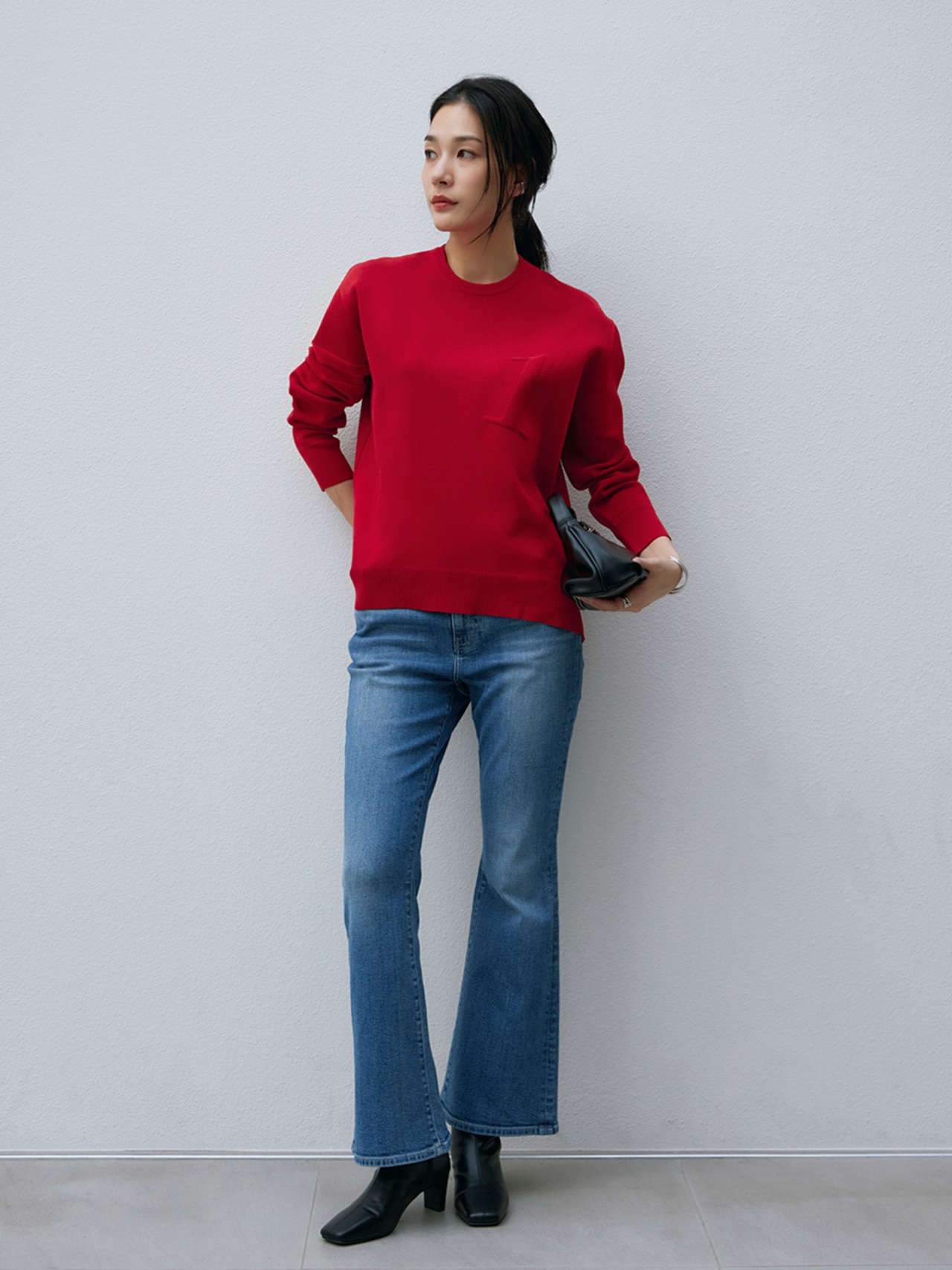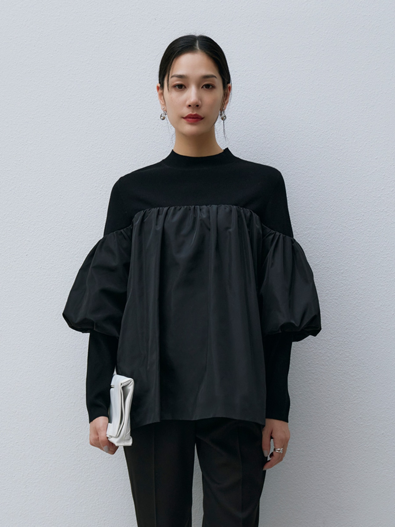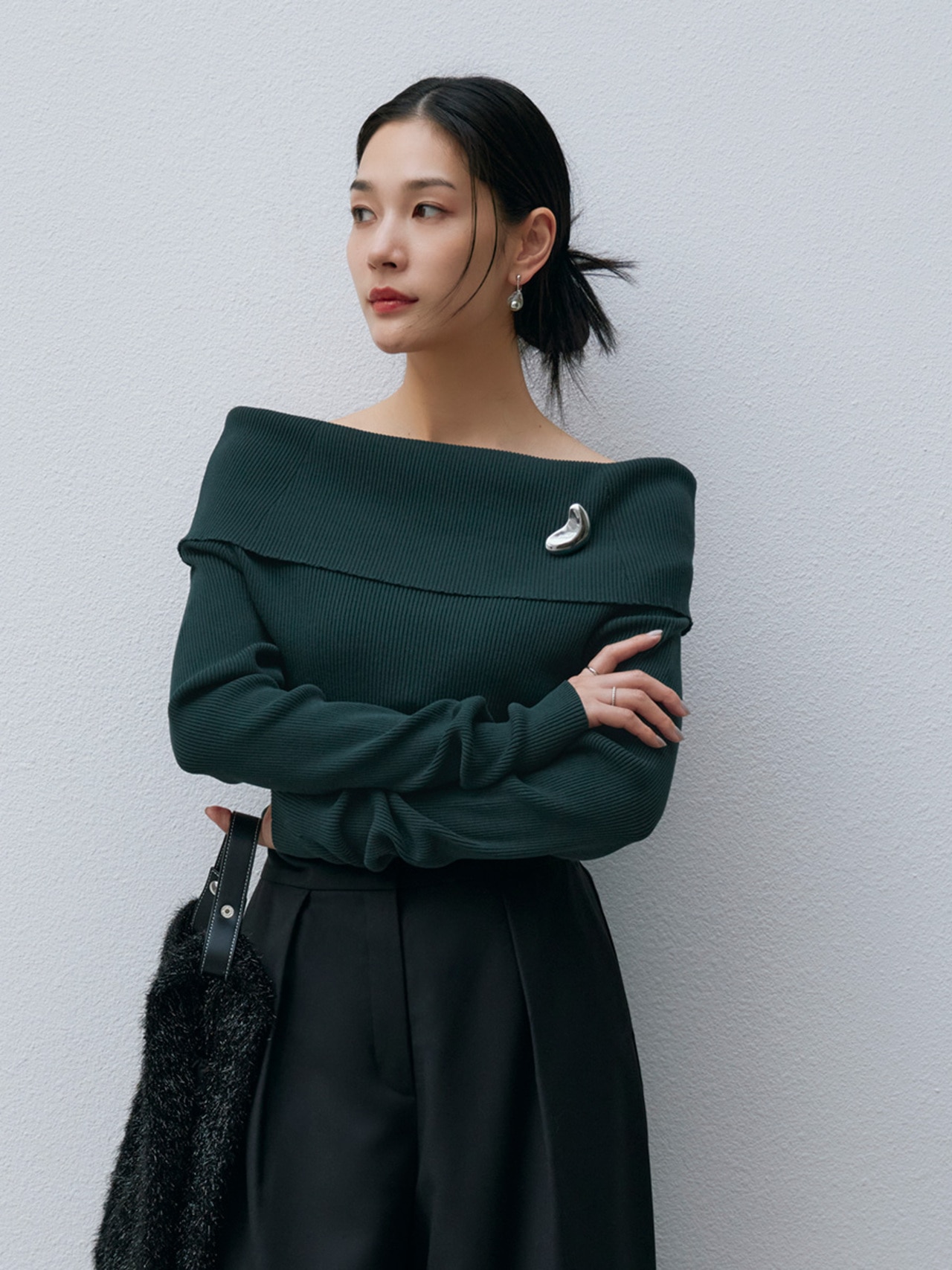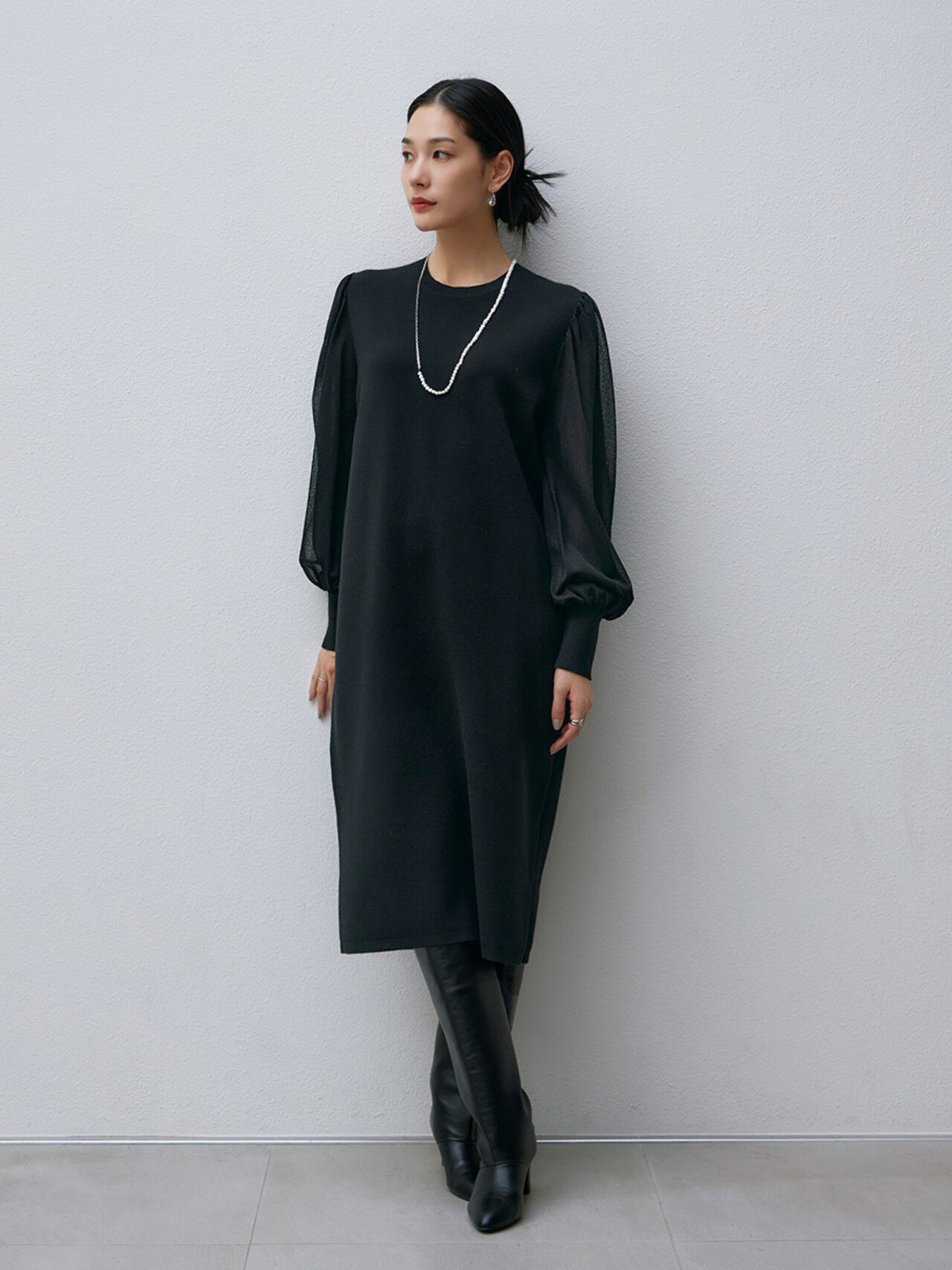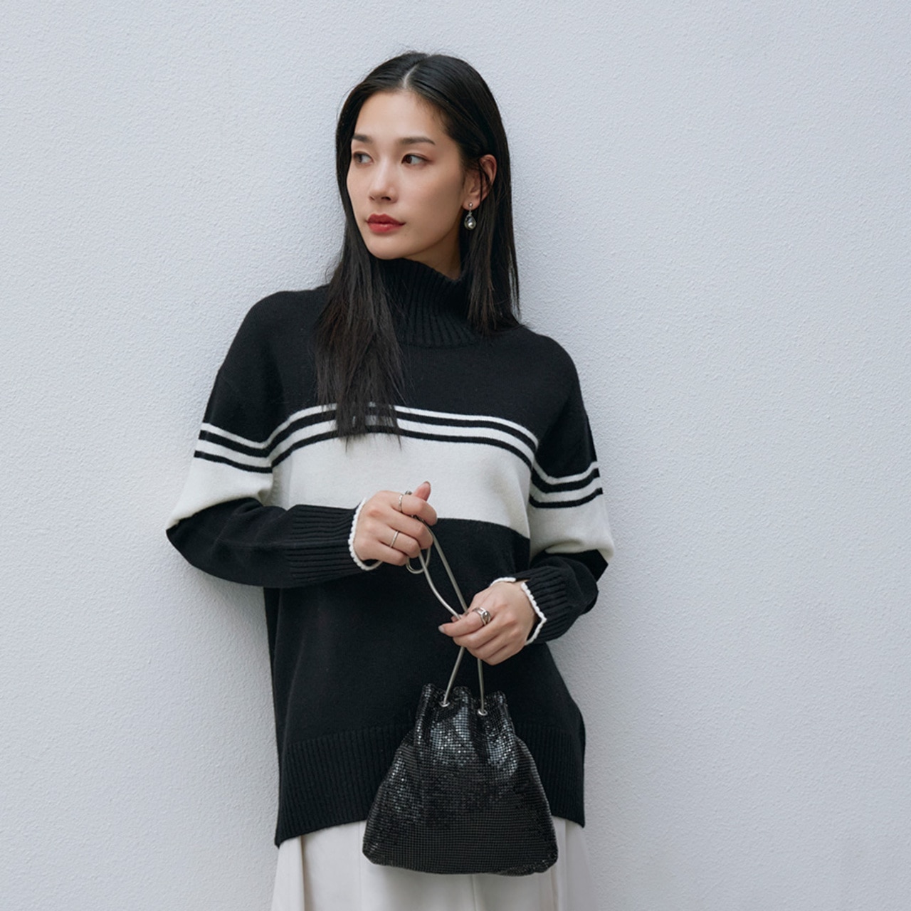 モノトーンカラーの配色ボーダーデザインで高級感のあるエレガントな装いに。きれいに立ち上がるネック、長めリブの袖口やスリット使いでエッジの効いた1着です。