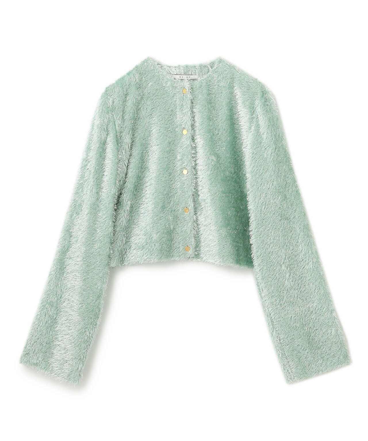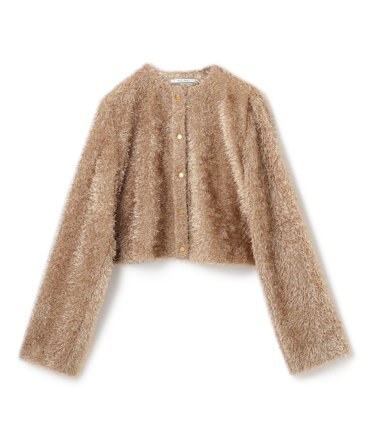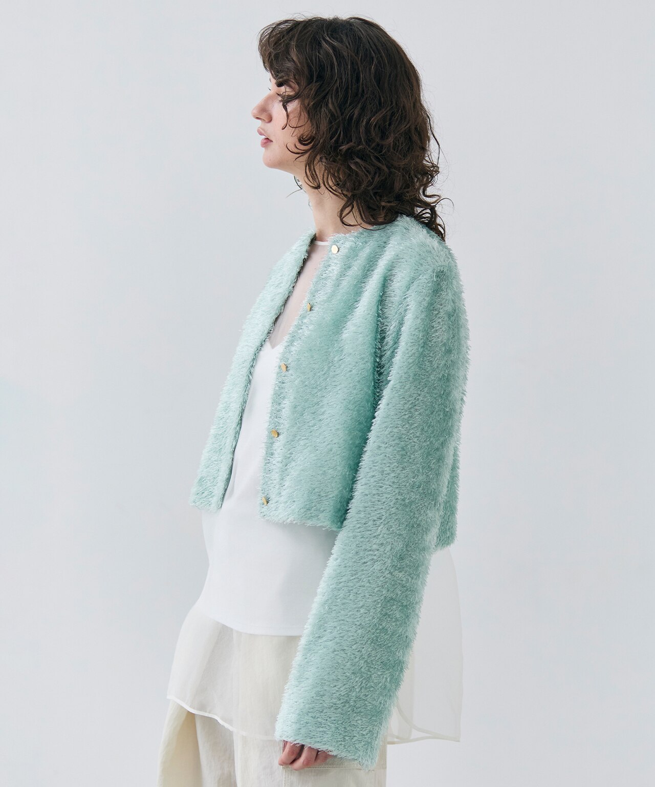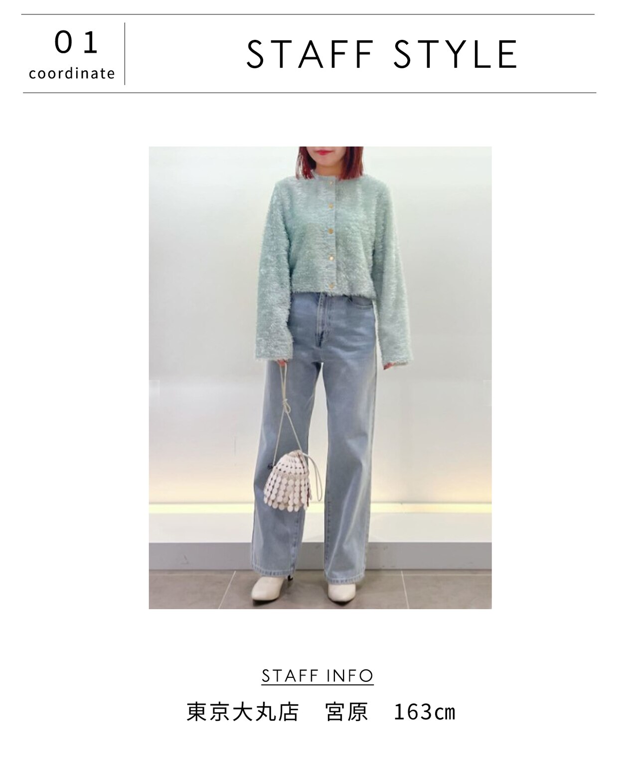 前開きでカーディガンのようにも着られるブラウスをデニムで合わせたカジュアルコーデ。ファーのような見え感で、華やかさがあるので、ワンピースなどに羽織ってオケージョンにも着られます。中に薄手のタートルインナーを入れたりと着回しのきくアイテムです。とても軽く、身幅や袖などもゆったりとストレスフリーな着心地です。