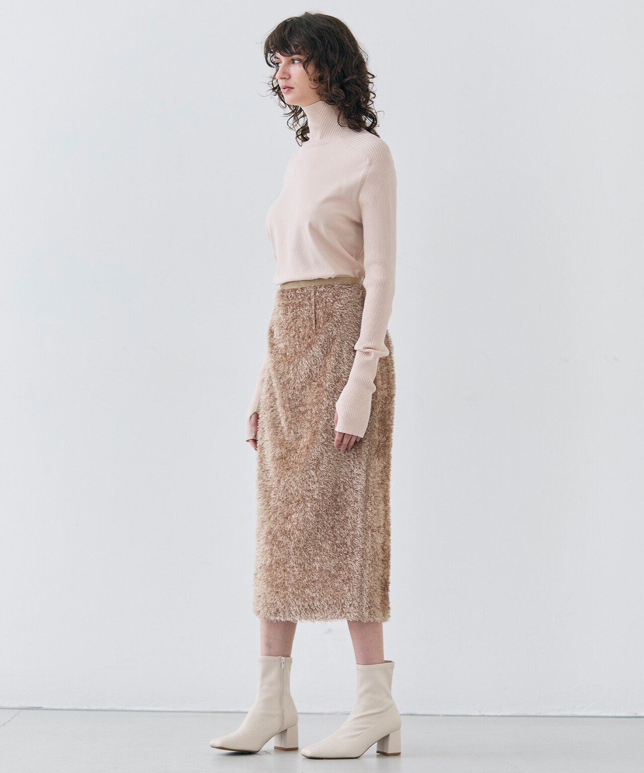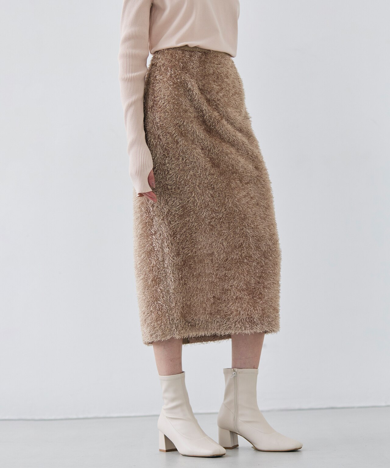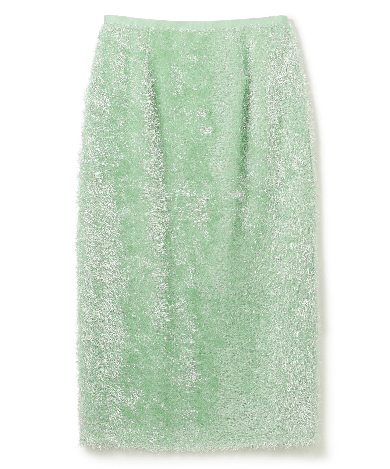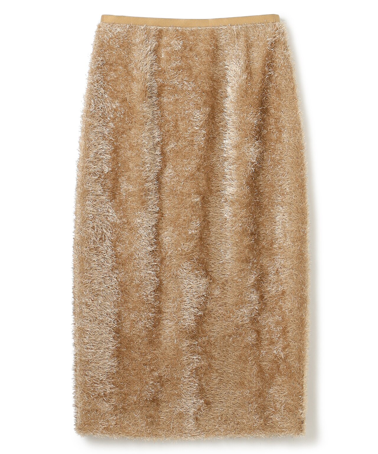 ファーのような素材感が目を引き、後ろファスナーとウエストのグログランリボンが全体を引き締める柔らかな上品さ感じるデザイン。ブラウスなどを合わせてキレイめに、Tシャツなどを合わせてカジュアルに幅広くスタイリングできるスカートです。