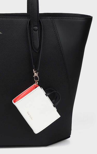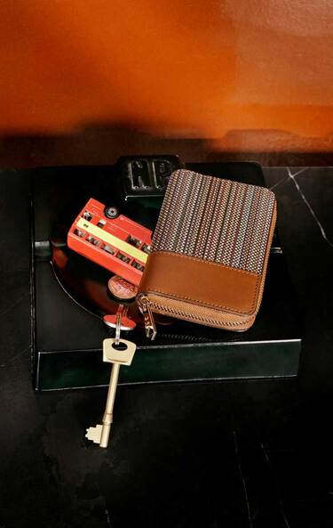 繊細な市松模様の美しいシグネチャーストライプとレザーをコンビネーションさせたコインケース。