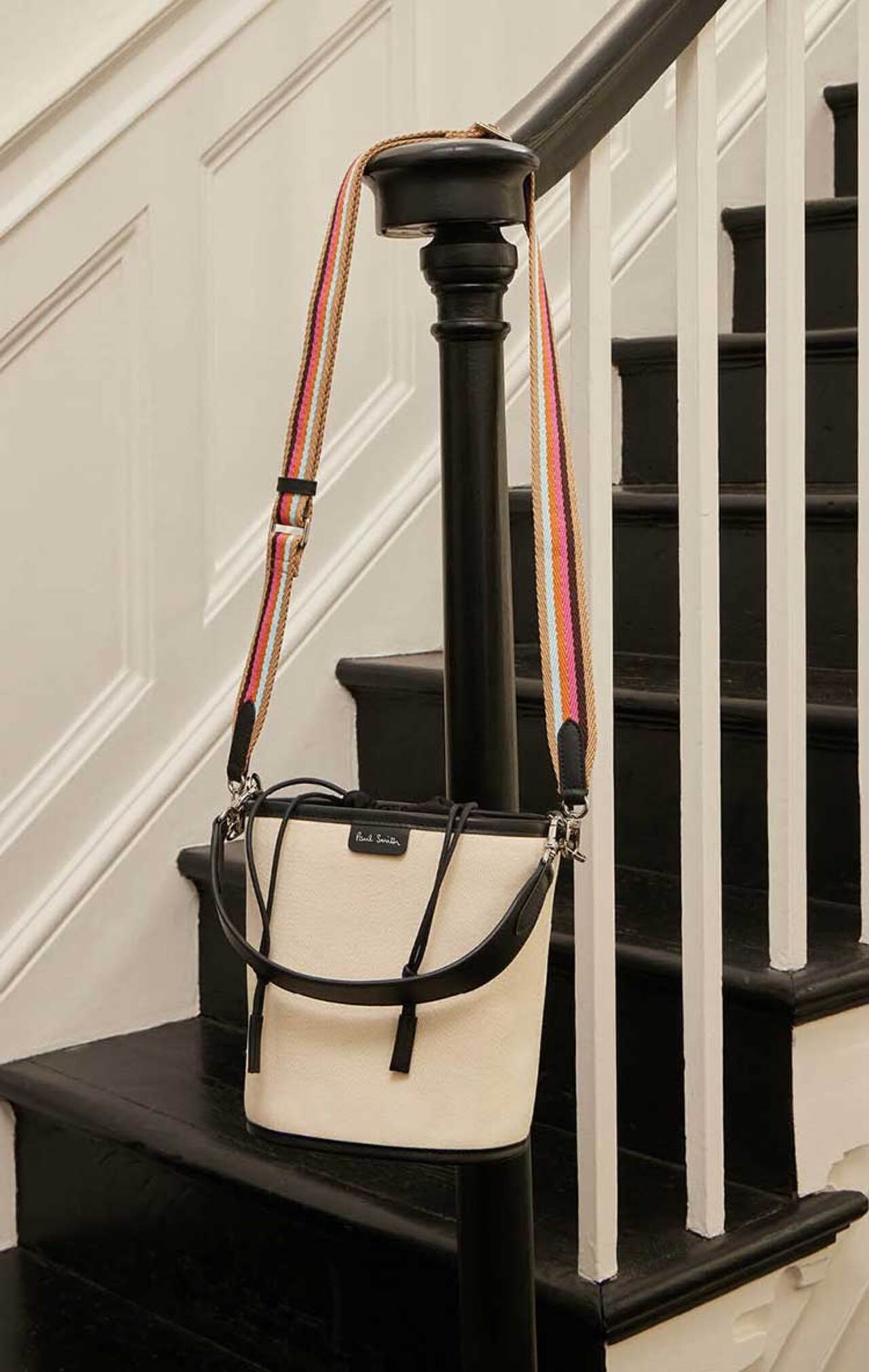 鮮やかなスワールカラーテープを使用したショルダーストラップが印象的な2WAYショルダーバッグ。