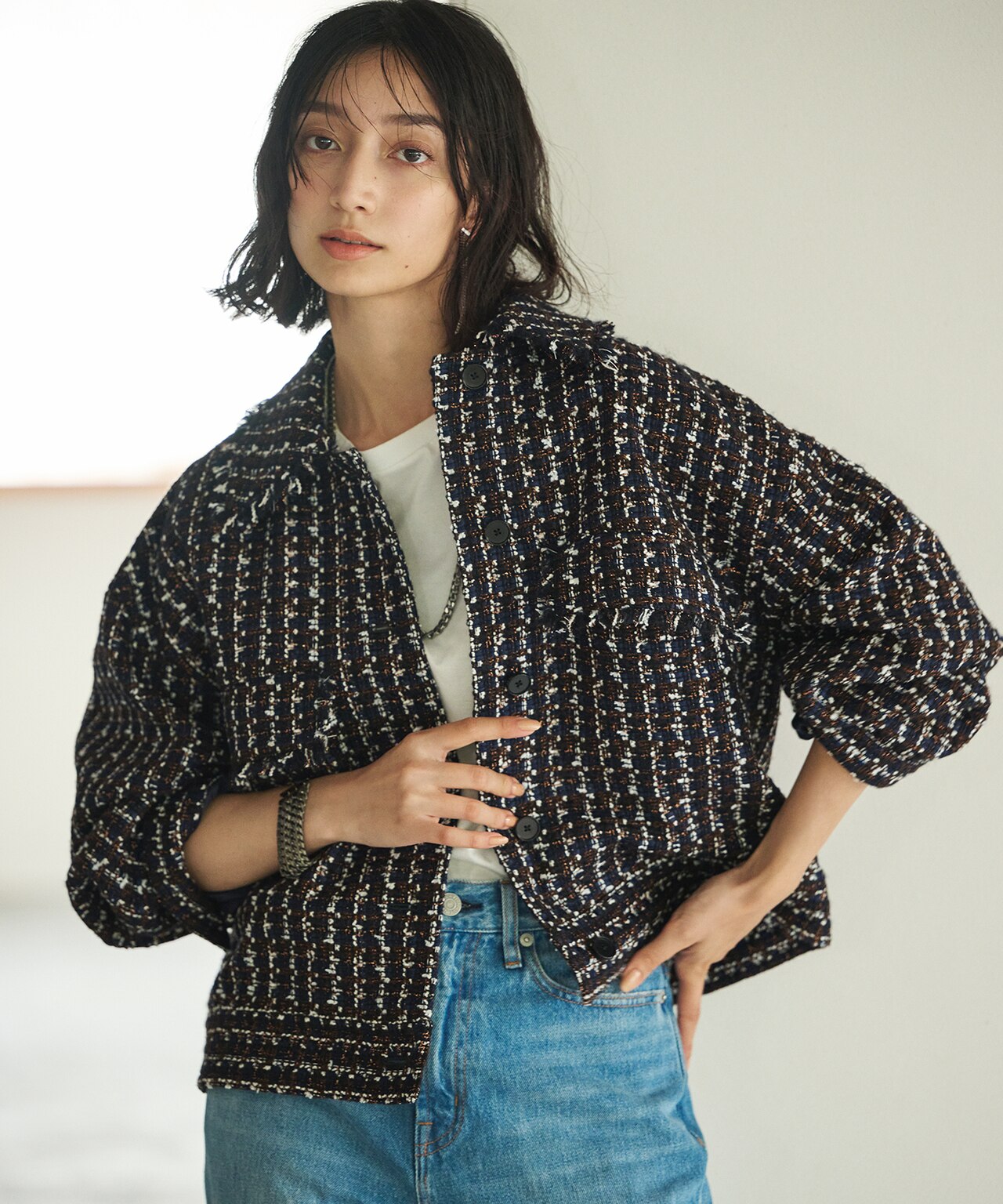 オフボディなシルエットが今っぽい、ツイードブルゾン