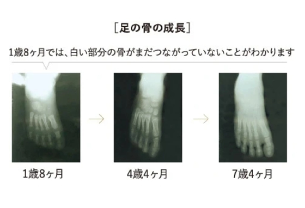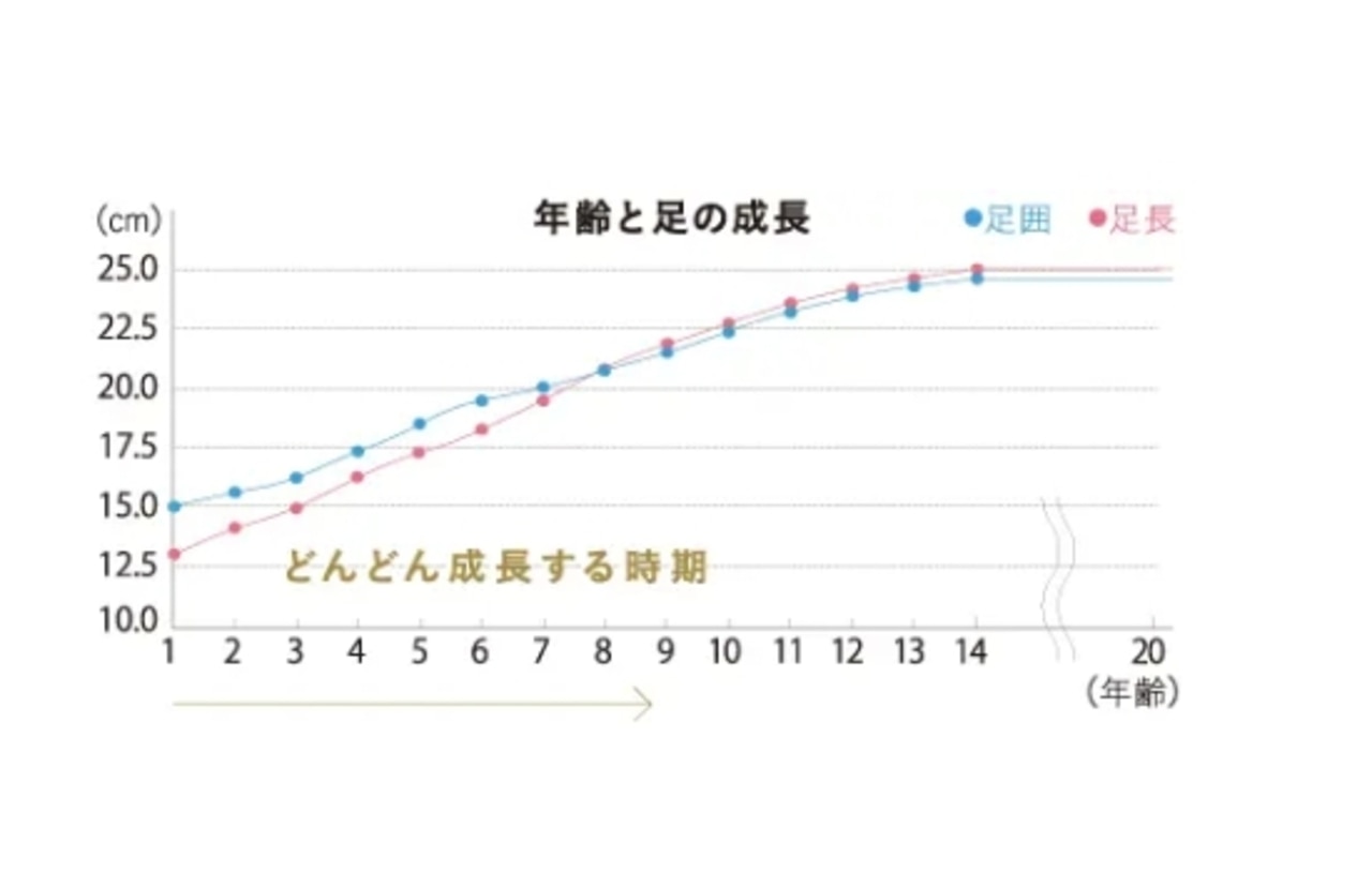 赤ちゃんの足の成長は非常に早く、2歳頃までは1年間に約1cm大きくなります。足は13〜15歳頃まで成長し続け、成人の骨格に近づいていきます。そのためはじめはちょうどよいサイズのくつも気づくと窮屈になっていることがあります。3ヶ月程度を目安にこまめに足の計測を行うよう心がけ、お子さまの足に合った最適なサイズとデザインのくつを選んであげましょう。