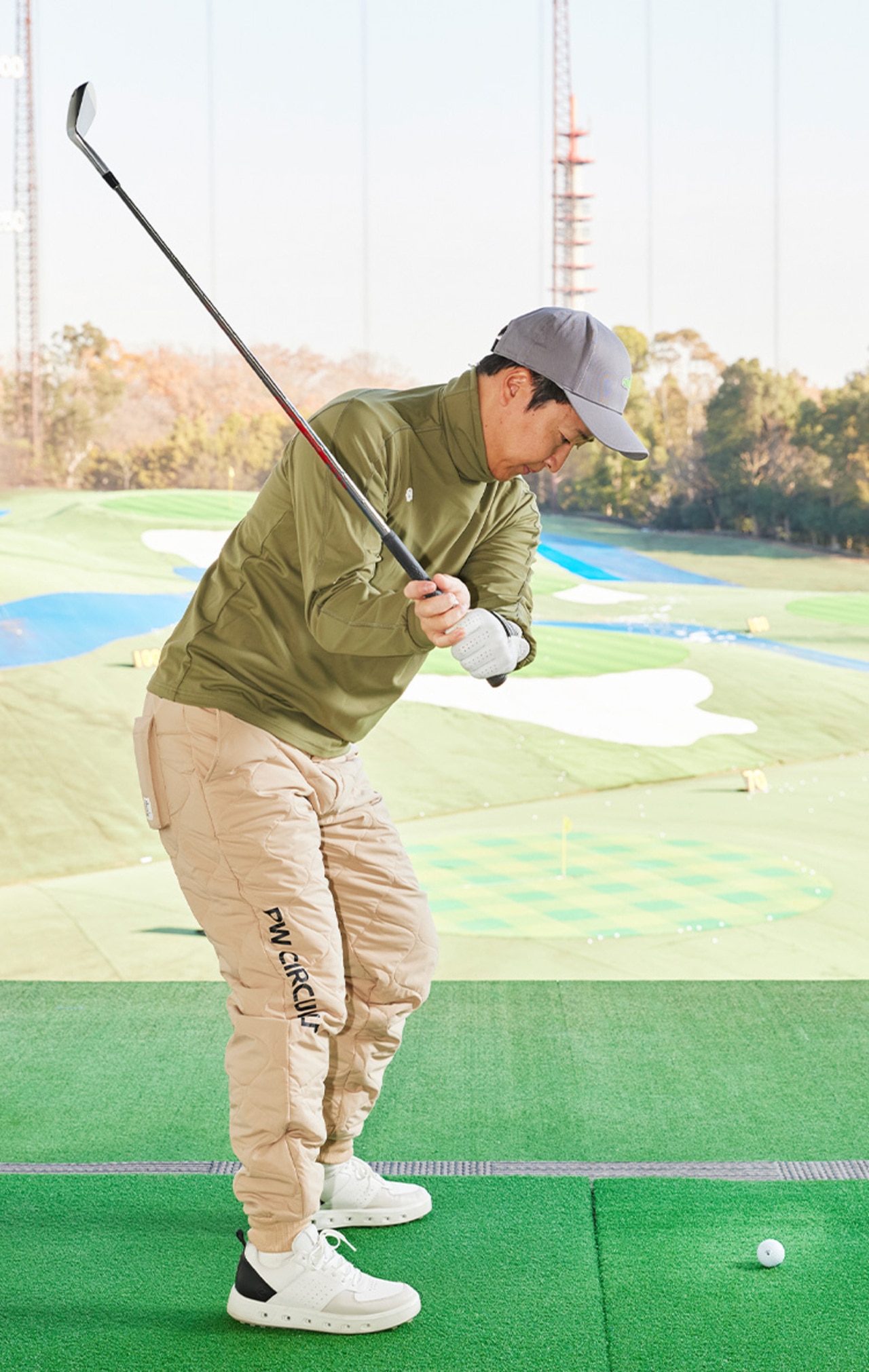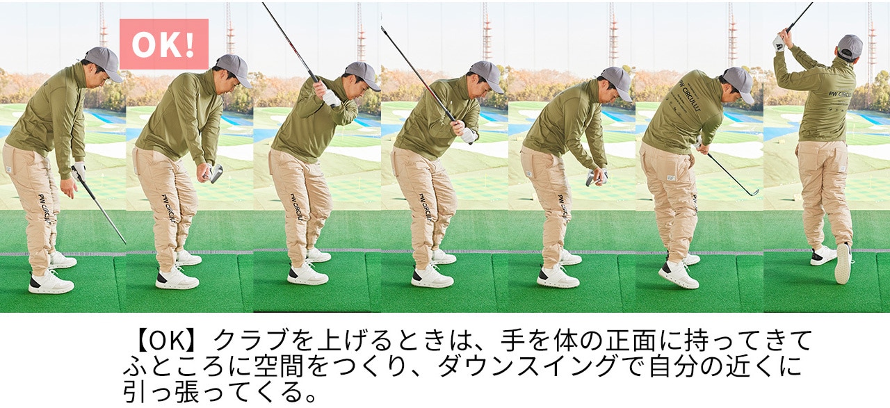 ☑クラブを上げるときは、手を体の正面に持ってきてふところに空間をできるよう意識します。