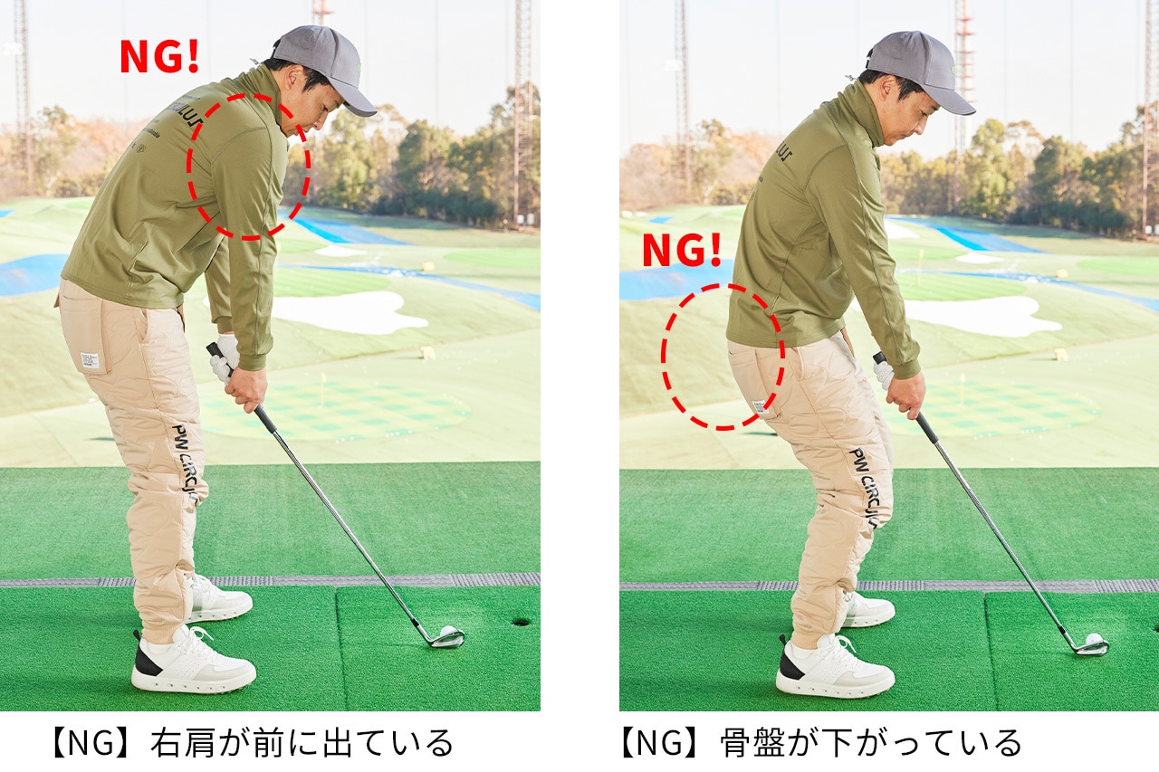[左] スライスが出やすいアドレスとして、写真のように腰が据わってしまった状態もNGなので、合わせて確認してください。