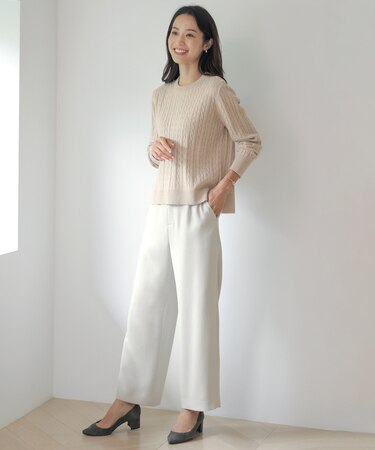 朝晩の冷え込みがつらい1月に頼れるのは、やっぱりダウンコート。洗練されたネイビーカラーのダウンコートに白いパンツを合わせて、すっきりとまとめる。インには、柔らかな印象を与えるケーブル柄のベージュニットで、コートを脱いだ時もきちんとした印象に。