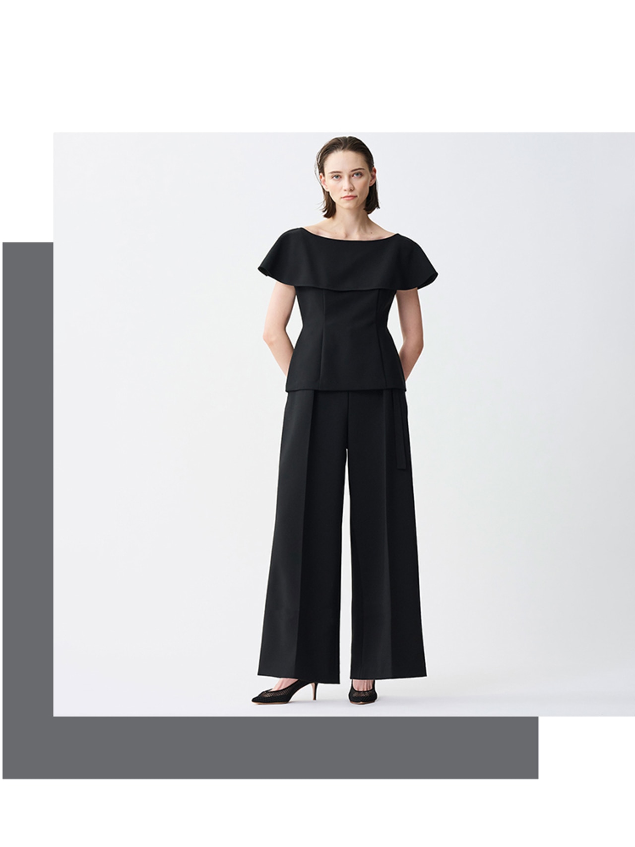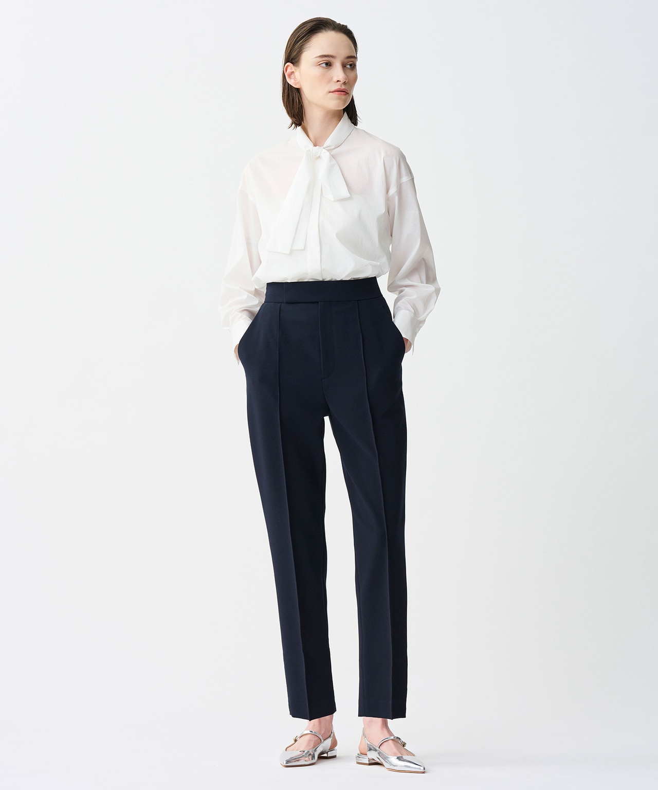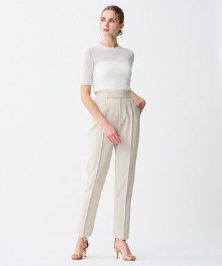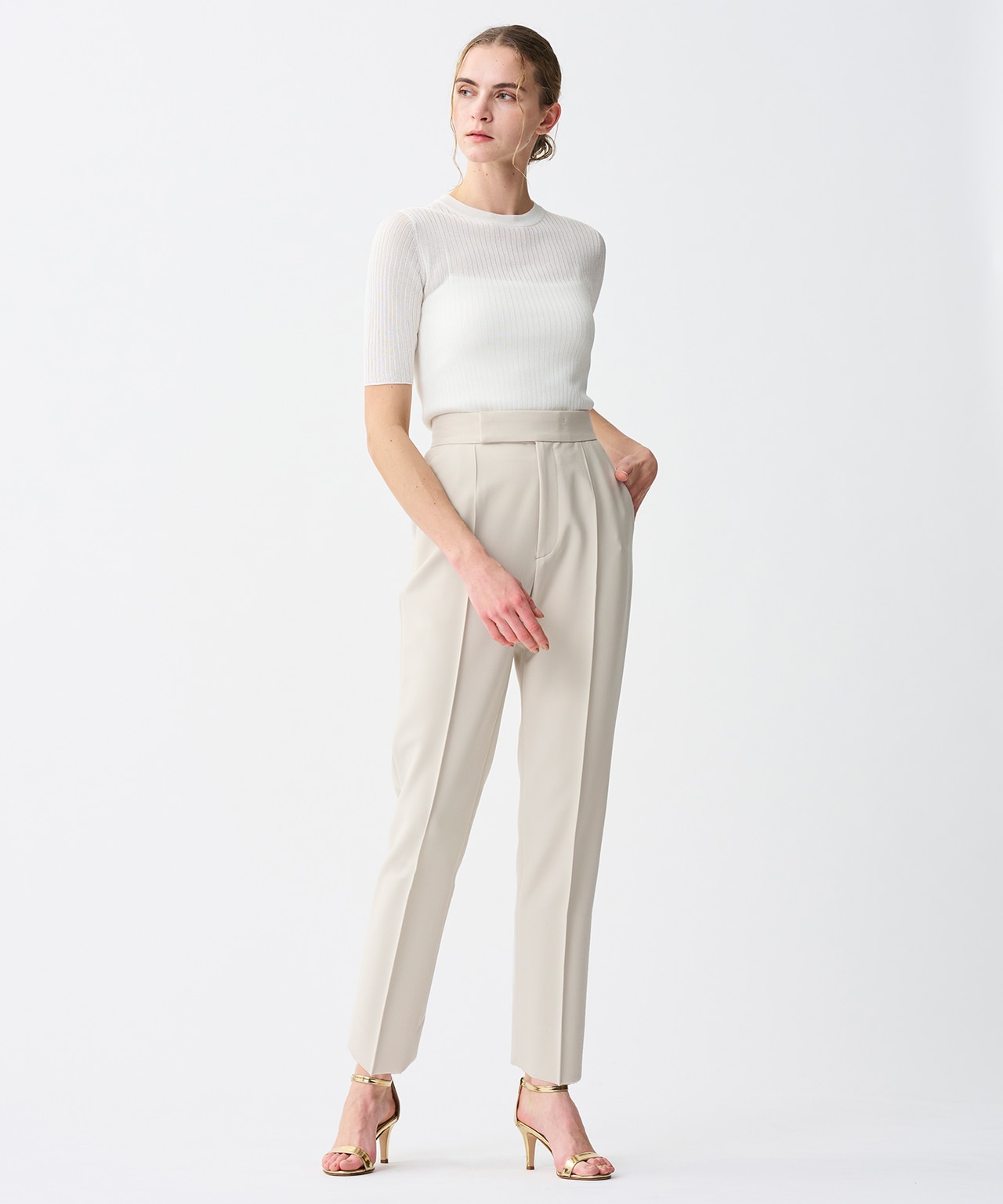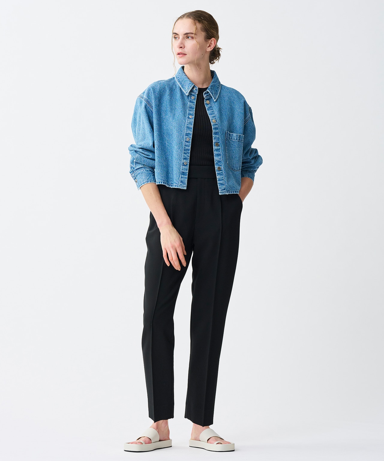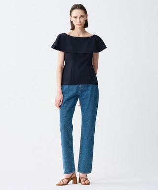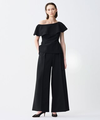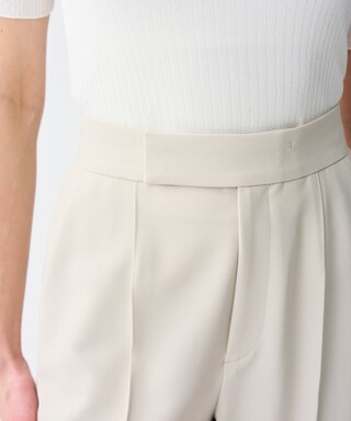 通常よりも高めのハイウエストと真っすぐワイドなシルエットによって足長効果抜群のワイドパンツ。