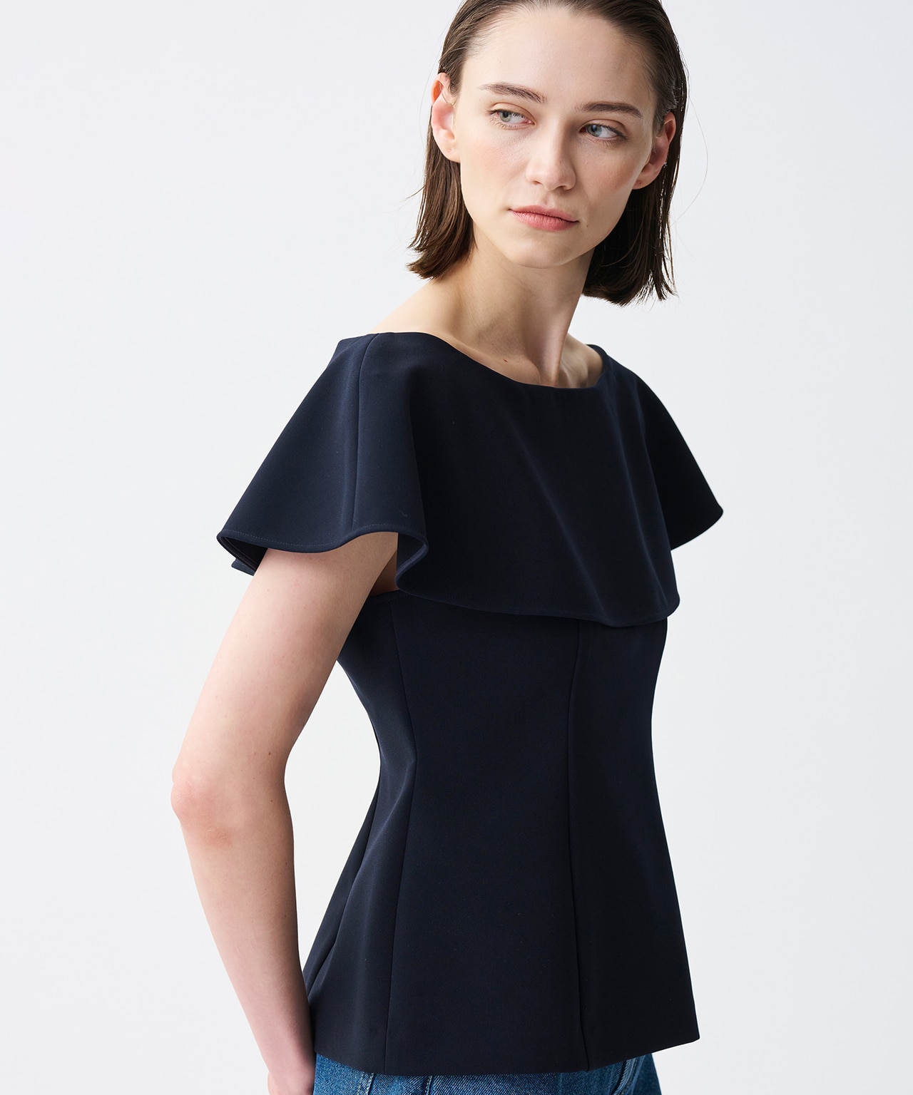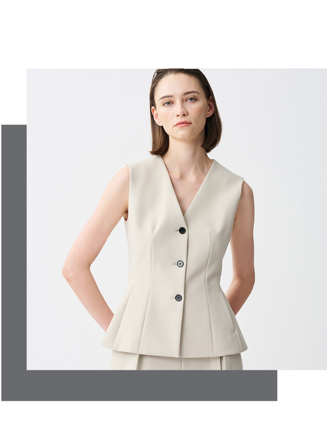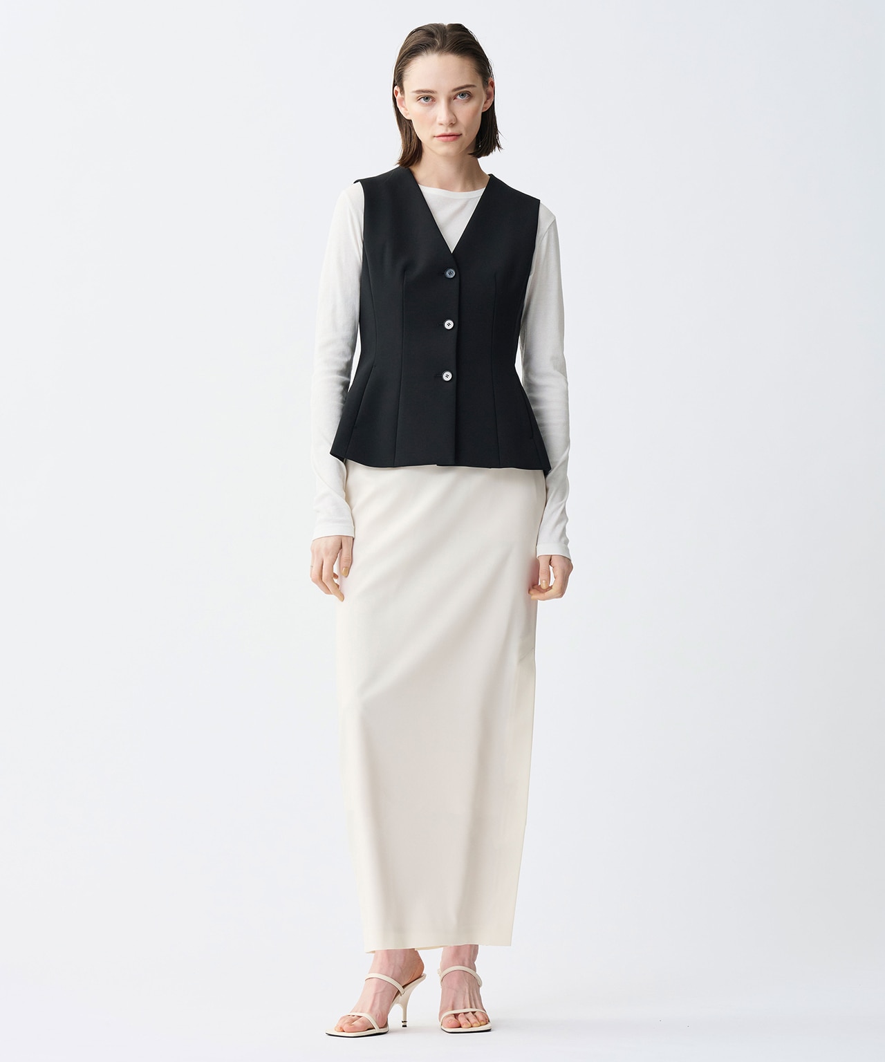 素材のハリ感を活かし、ウエストのカービーラインを美しく表現したジレ。