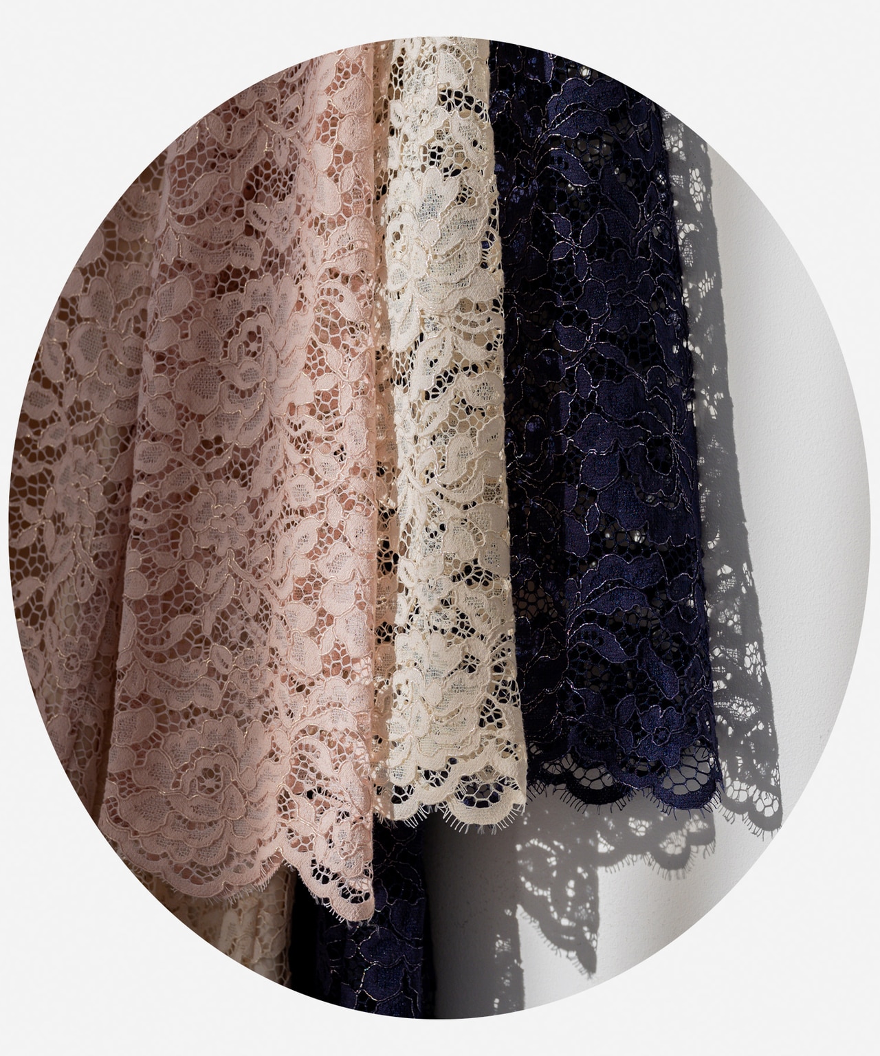 繊細な花柄レースを贅沢に使用した正統派な1着。控えめなラメ感が魅力のチークピンク、シャンパン、シックネイビーの3色展開です。