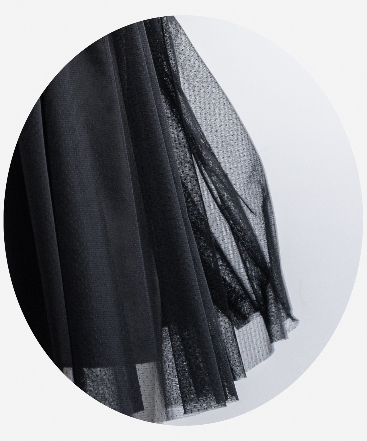 ジョーゼット素材で仕立てたトップスに、ふわりと揺れる異素材ドットチュールスカートをあわせた人気デザインの新作。