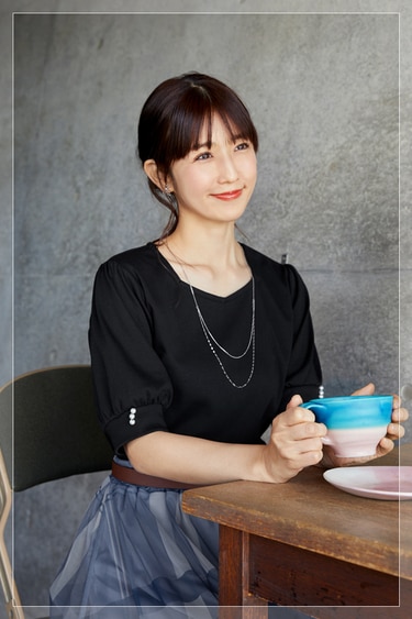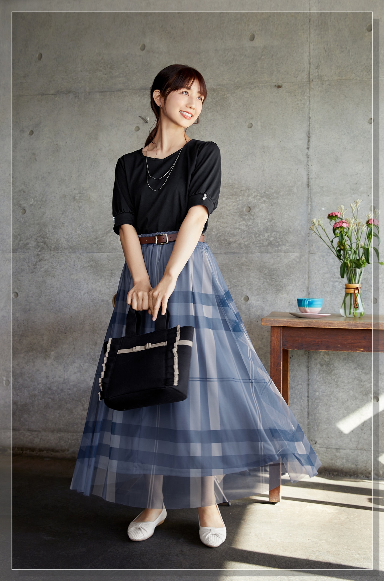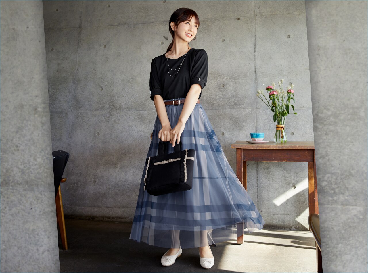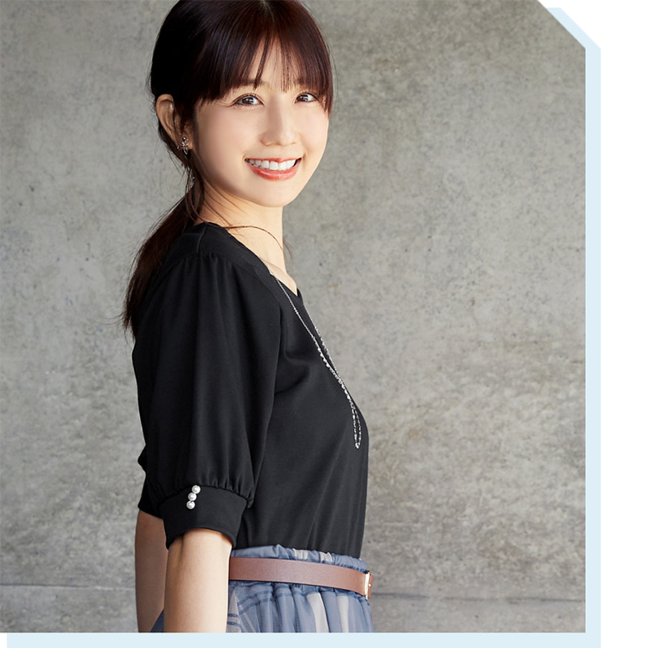 シンプルなのに大人かわいさを感じられる、パフスリーブトップス。どこか上品さが香るのは、ふわっとした袖にパールが付いているおかげ。着まわしやすいブラックには、華やかなスカートを合わせて夏らしいコーデに。