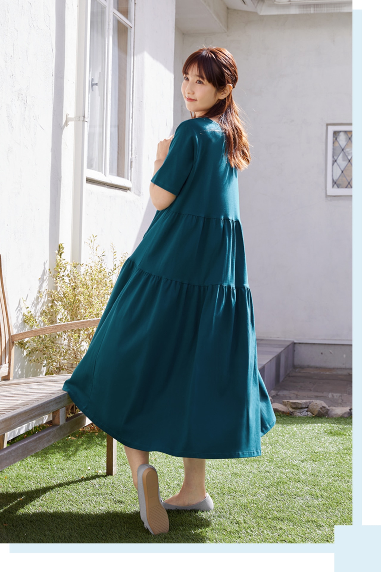 スタイルアップできて、おしゃれに決まるティアードワンピース。今年は思い切って、夏に映えるターコイズに挑戦。汗ジミ防止加工で気になる汗もへっちゃら。