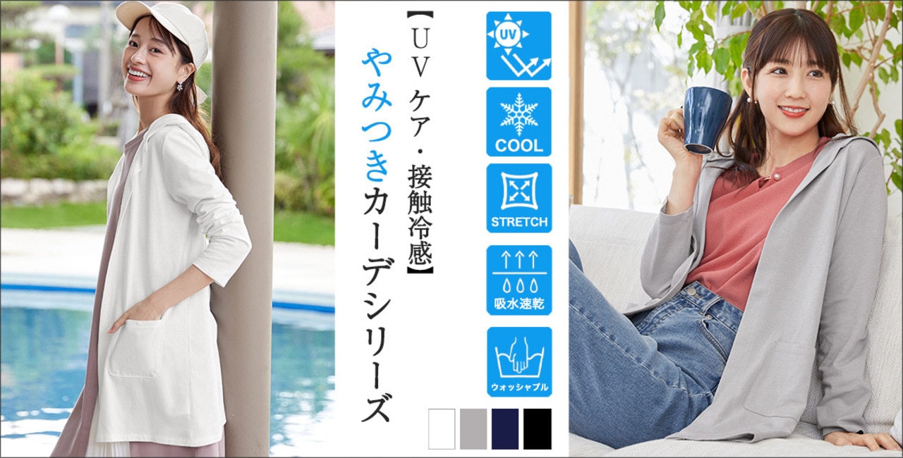 日焼けや冷房対策におすすめのサマさまカーディガン。接触冷感で夏でも涼しく、快適に。羽織るだけできっちり感がでるデザインは、上品ワンピにも相性抜群。