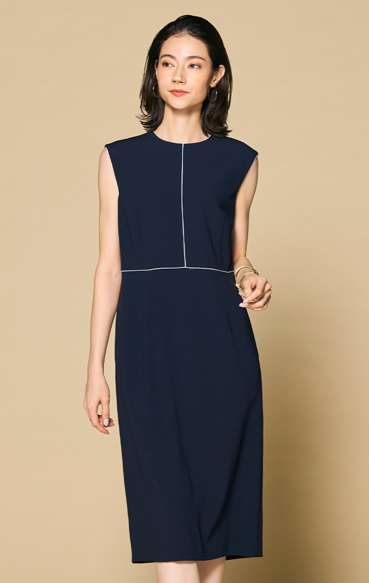 すっきりとしたデコルテと上品な膝下丈の計算された華やかさを感じて。