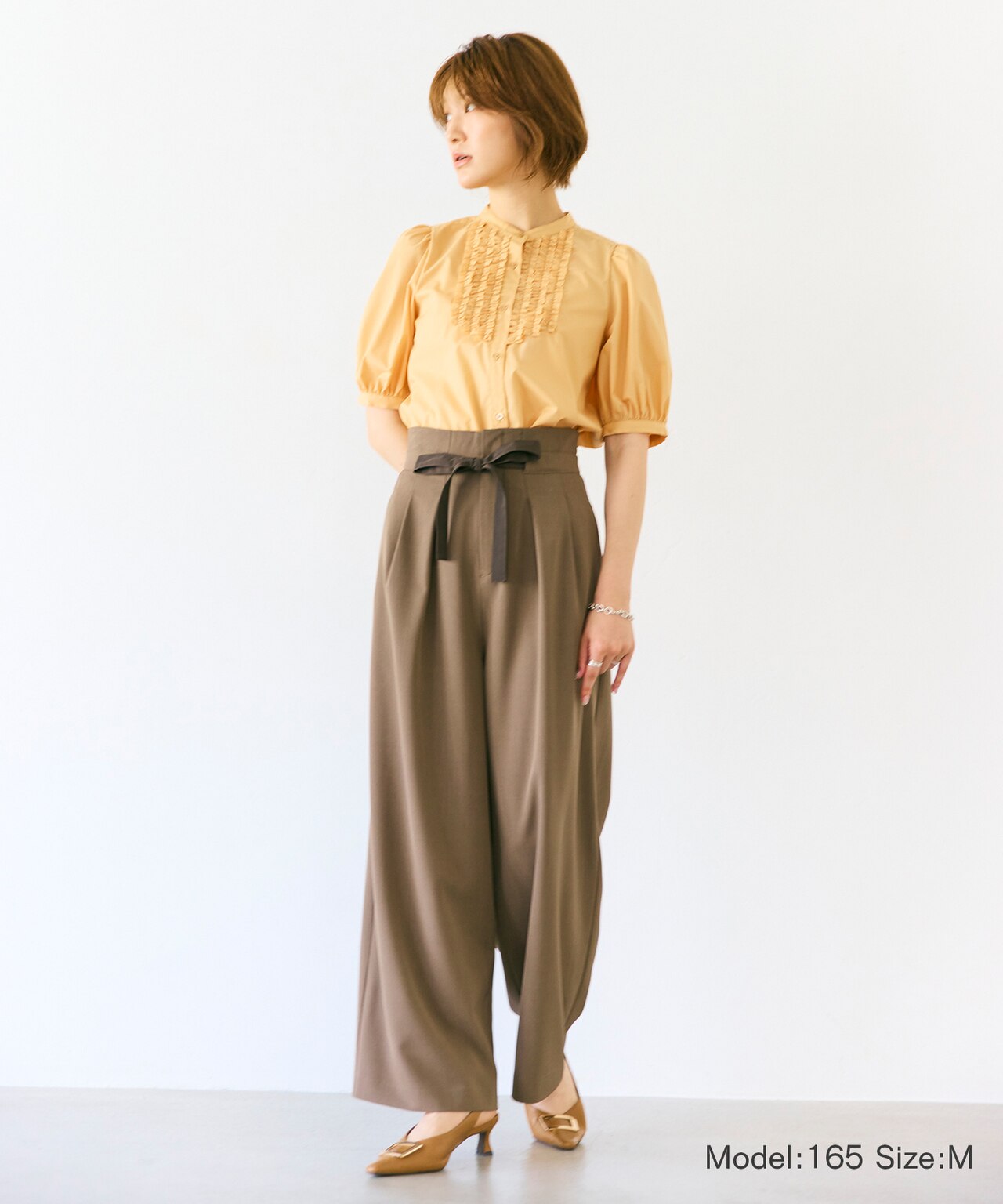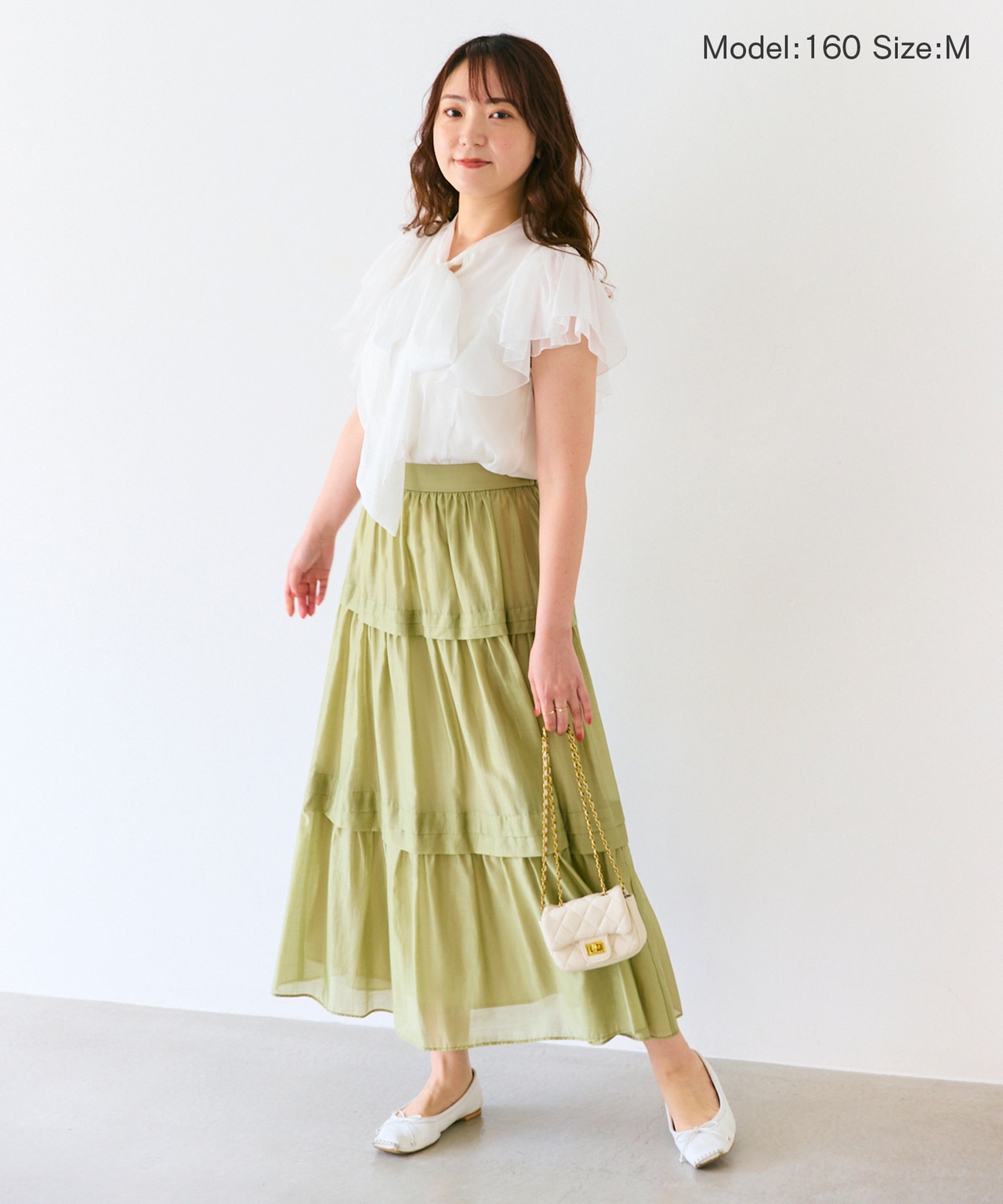 ふんわりブラウスとスカートが華奢見えと可愛さを実現するコーディネート。