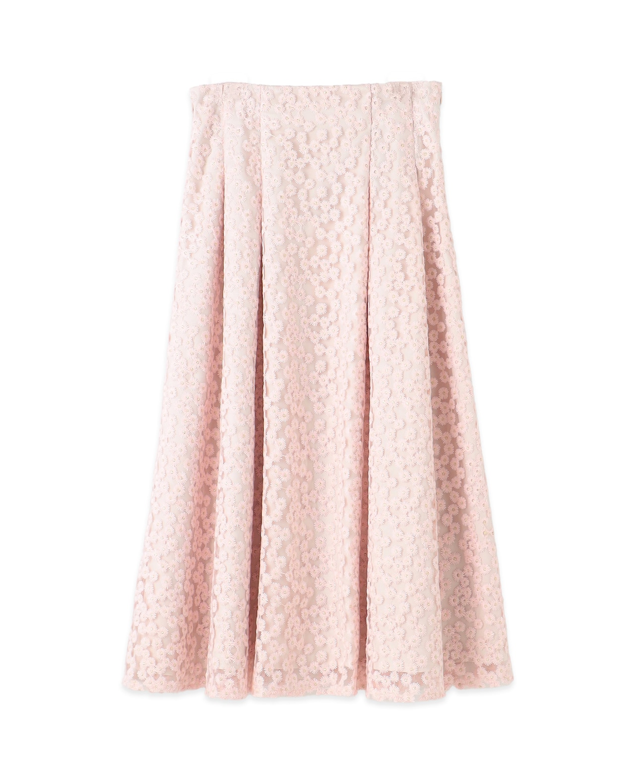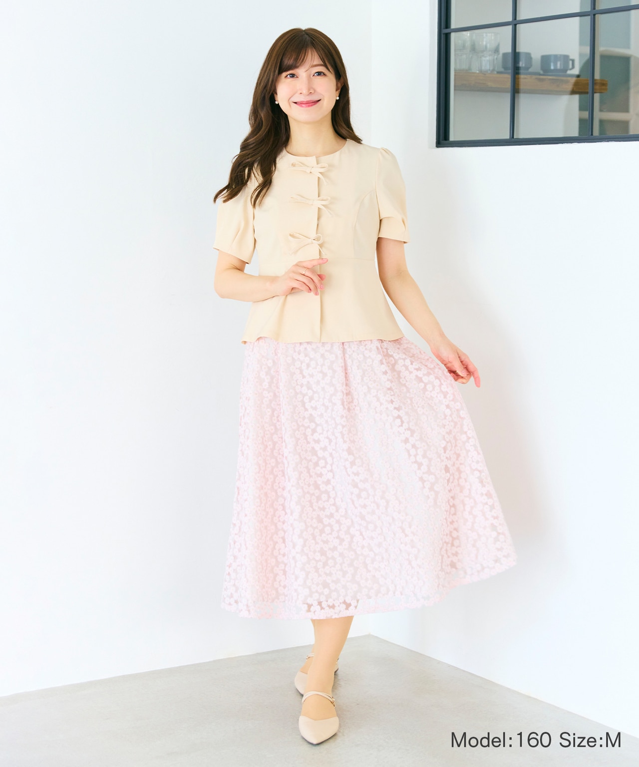 二の腕すっきりブラウスとハリのある小花の刺繍スカートで可愛く着やせ見えの嬉しいスタイル