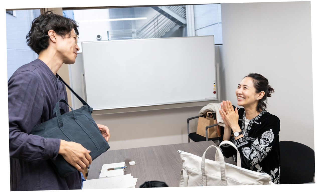 実は、たまたま持ち込んでいたプロトタイプのトートバッグがコラボのアイデアベースに。まるで運命だったかのようにはまじさんも「これだ!」とスムーズに物事が決まっていったのです。