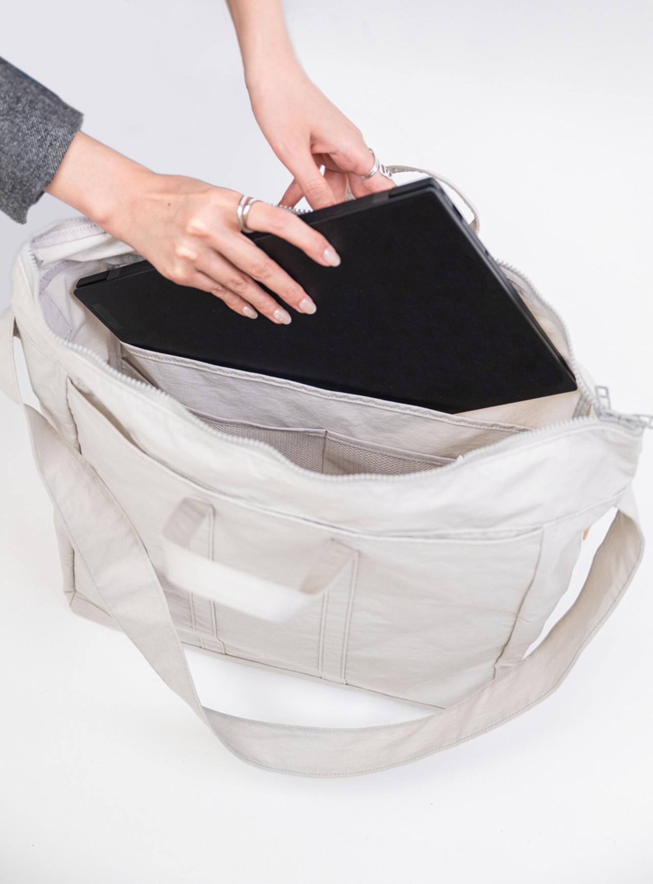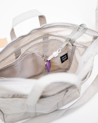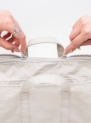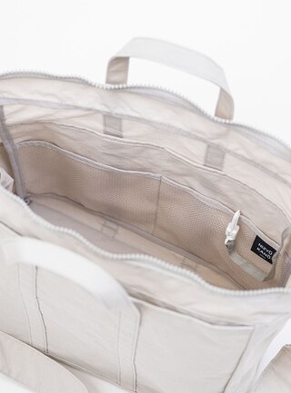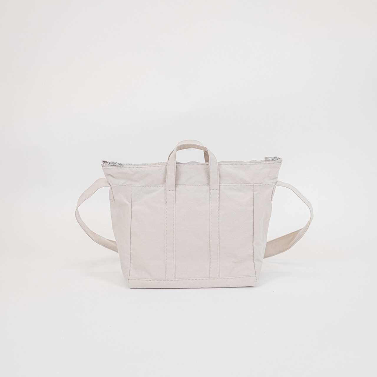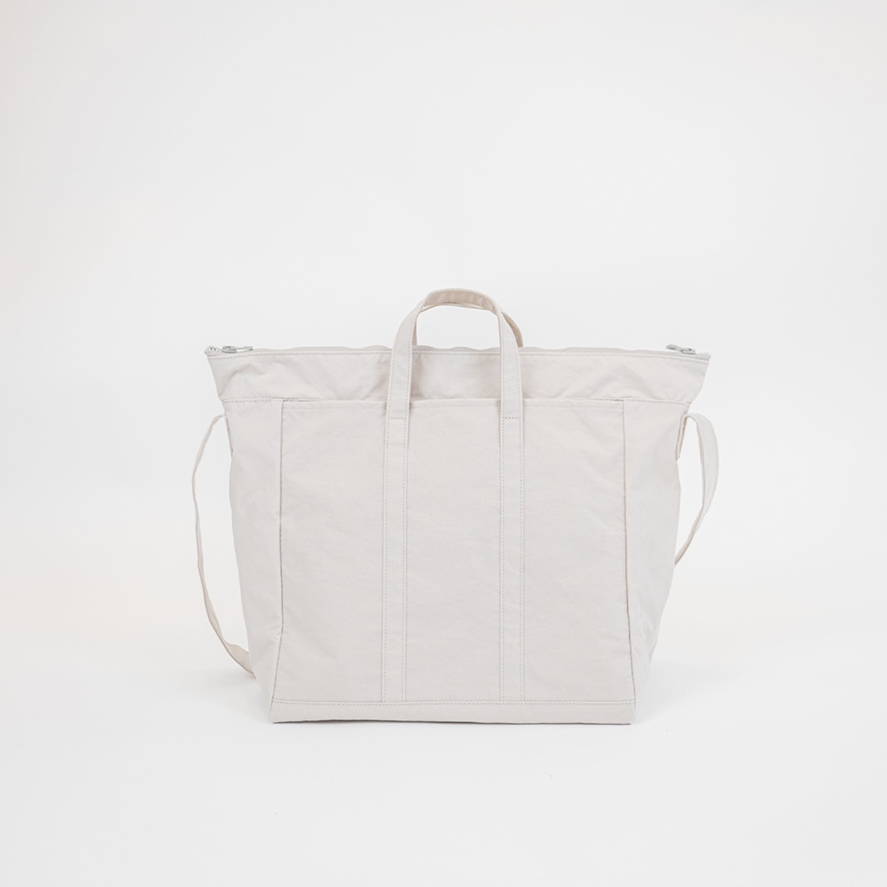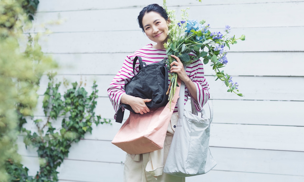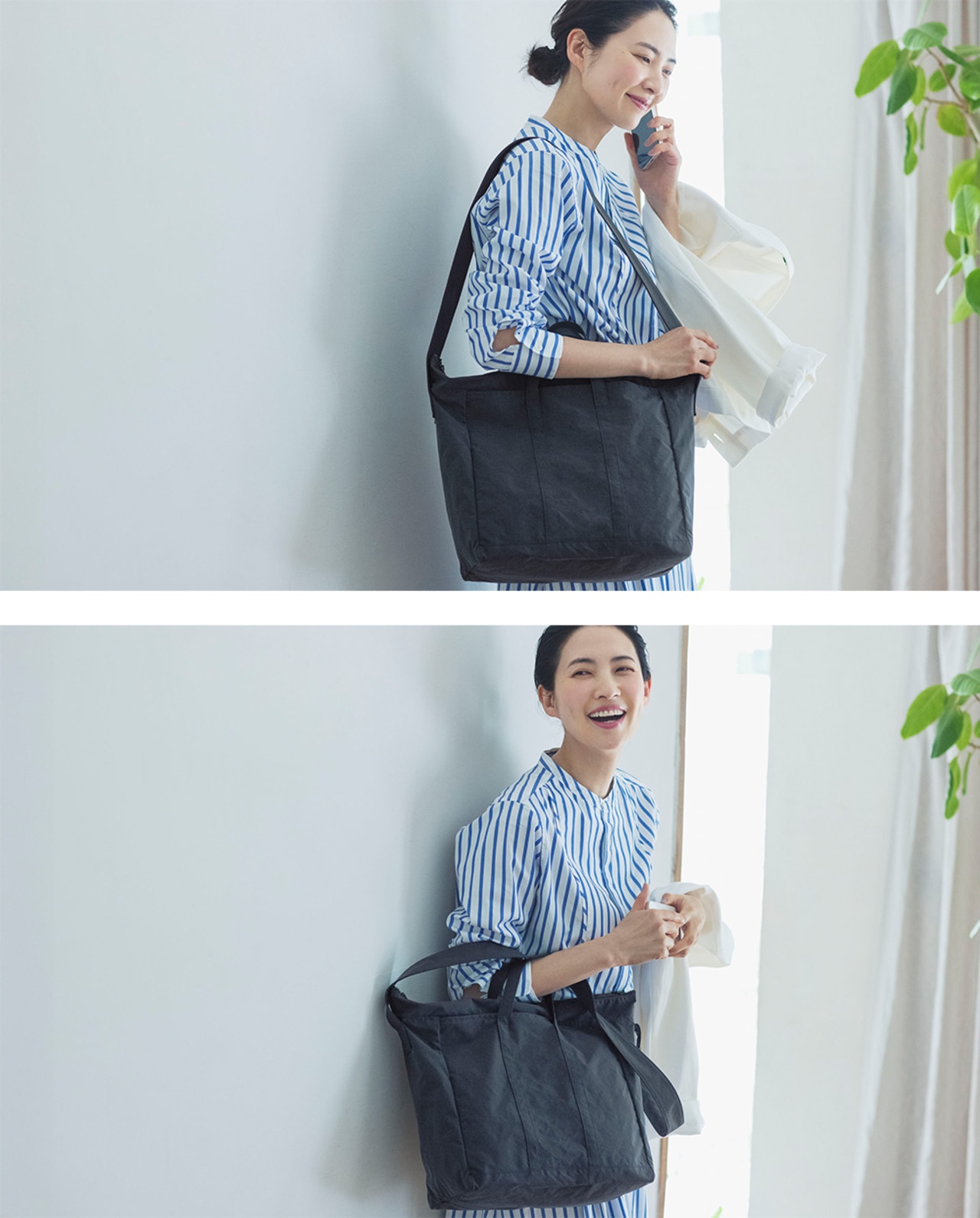 国産の軽量でハリのあるナイロン生地を使用しており、一見コットン由来のような優しい風合いの見た目。無駄に装飾がない洗練されたシンプルなデザインのため、デイリーユースは勿論のこと、通勤用にも使える嬉しいデザイン。利用シーンに合わせて3サイズ、お好みに合わせて3カラーを贅沢にご用意しています。
