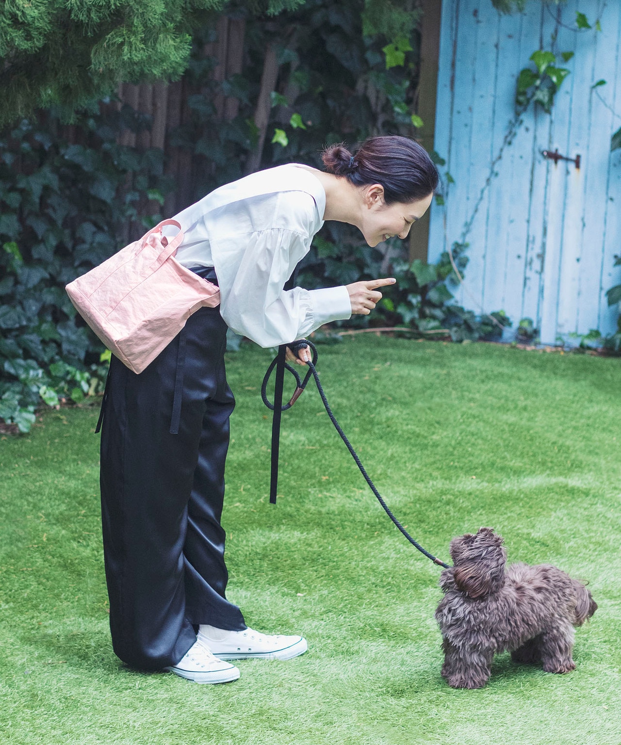 今回のスペシャルゲストである、はまじさんの愛犬ピコちゃんとの2ショット。甘すぎない絶妙なピンク色ははまじさんセレクトで、気分を上げてくれること間違いなしのカラーです。