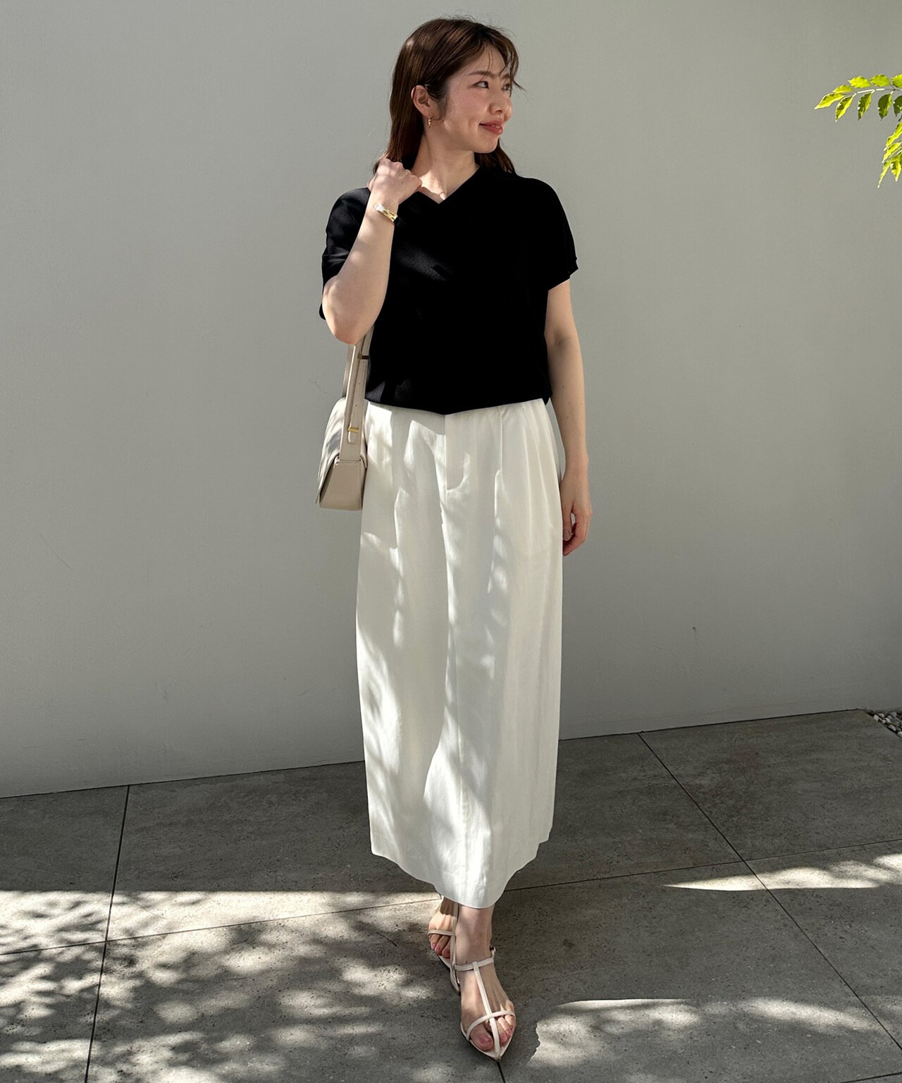 ベーシックカラーのトップスも、オレンジのスカートで一気に夏らしい鮮やかな印象に!
